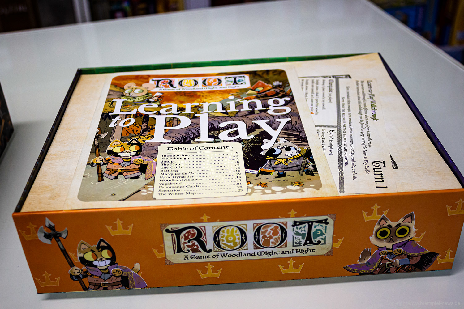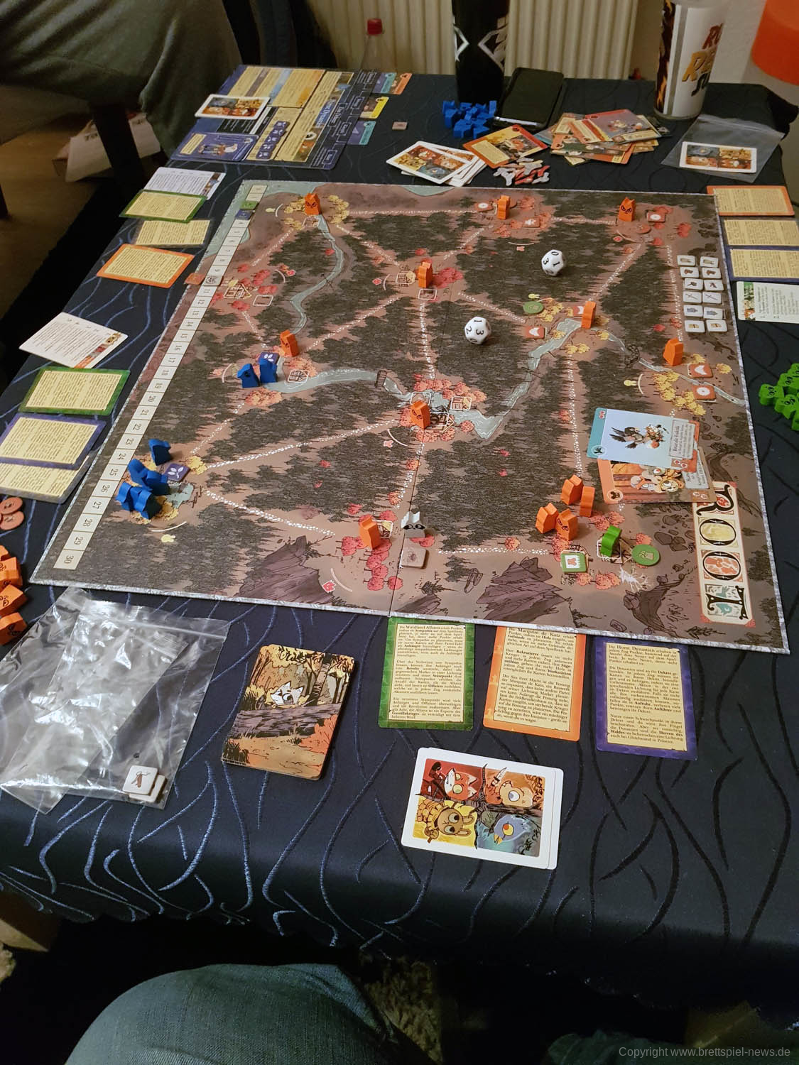 Die vergleichsweise kleine Schachtel von ROOT ist bis zum Rand mit hölzernen Figuren, Karten und Markern sowie dem großen Spielfeld, den Spielertableaus und gleich mehreren Regelheften- und Übersichten gefüllt. Dies ist auch nötig, denn da sich die Fraktionen so unterschiedlich spielen, muss oft gerade am Anfang noch viel nachgeschlagen werden. Jeder Spieler hat dabei aber auf der Rückseite seines Tableaus schon eine Übersicht der Komponenten und der Spielweise. Dazu gibt es noch eine Referenzkarte, die Empfehlungen für die ersten Schritte beinhaltet.
