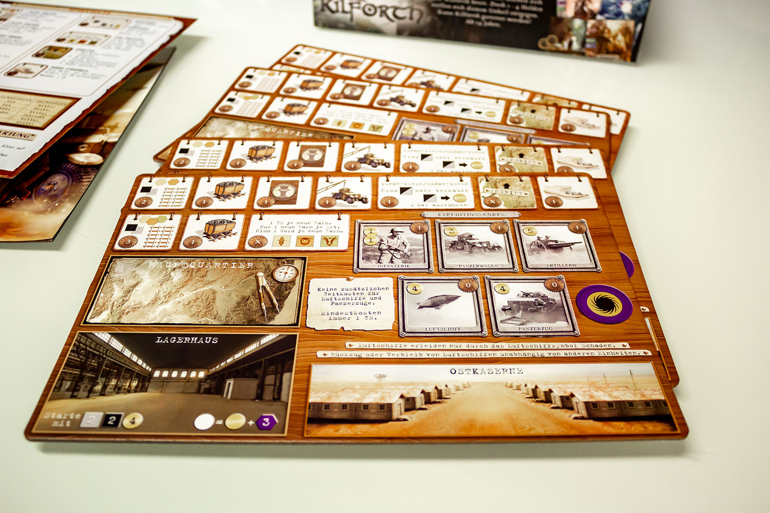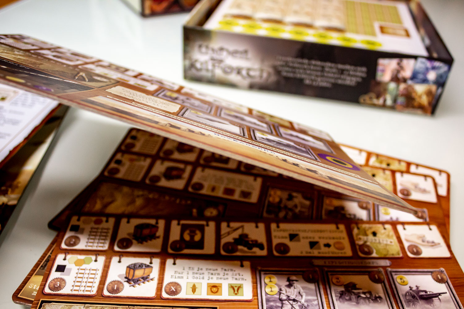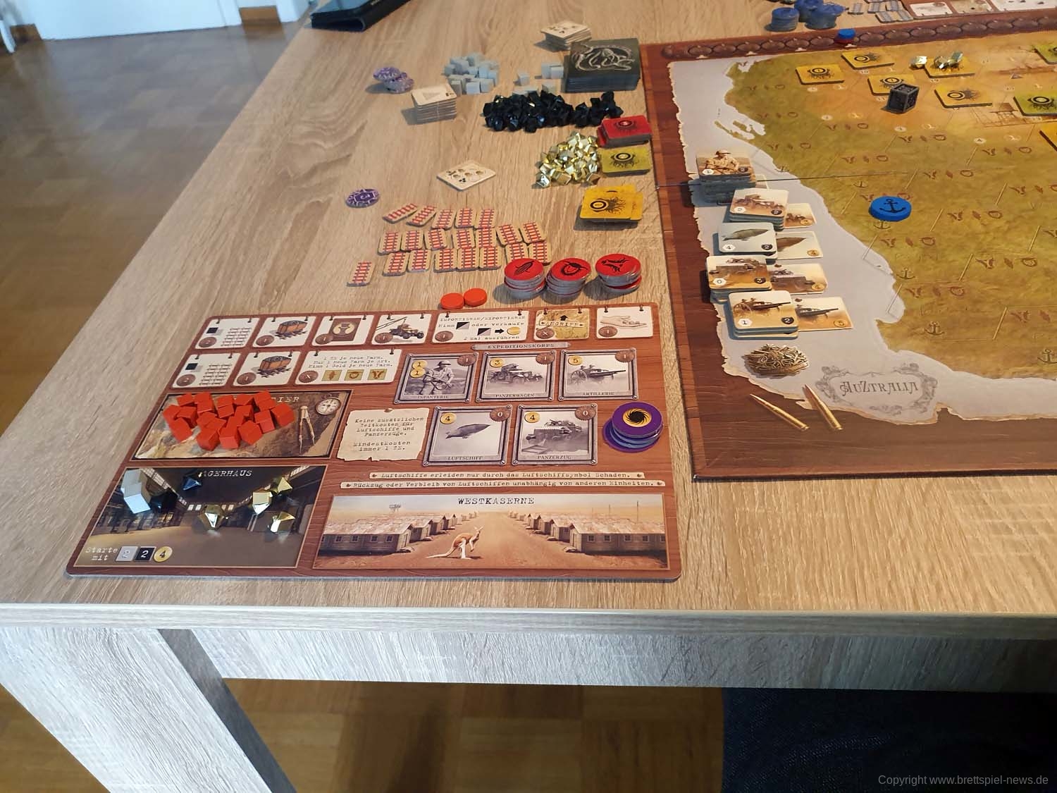 Der Druck der Karten, Marker und des Spielfelds ist sehr farbenfroh und scharf, wodurch alle nötigen Informationen auf einem Blick zu sehen sind. Die Ressourcenmarker Kohle, Eisen, Gold und Phosphor unterscheiden sich nicht nur in der Farbe, sondern auch im Material. Während manche aus kleineren Kunststoffkristallen gefertigt sind, sind andere aus Holz oder aus größeren Kunststoffkristallen. Eine Verwechslung oder ewiges Sortieren sind dabei somit nicht nötig. Das Regelbuch versucht vieles anhand von Grafiken und Beispielen zu erklären, jedoch sollten die SpielerInnen bei den ersten Versuchen noch die Erklärung des Spielmaterials zur Hand haben, da sonst schnell Verwirrung aufkommt. Für den ersten Aufbau des Spiels haben wir ca. 45 Minuten gebraucht, was den Umfang dessen deutlich macht. Hilfreich ist da auch der Schnellreferenzbogen, der alle nötigen Informationen beinhaltet.