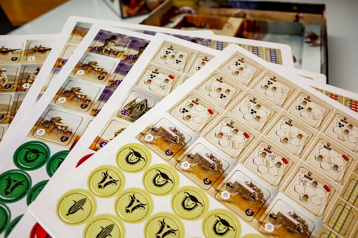 Die Box von „AUZTRALIEN“ bietet sehr viel. Enthalten sind: 84 Farmplättchen (3 mal 7 pro SpielerIn), 80 Gleisplättchen (20 stück pro Spieler), 20 Marker in Spielerfarben pro Spieler, 10 violette Schadensmarker für die „Großen Alten“, 1 violette Scheibe, 43 „Große Alte“-Plättchen, 50 Kohle-, 50 Gold-, 50 Eisen- und 7 Phosphatmarker, 36 Persönlichkeitskarten, 40 „Große Alte“-Karten, 30 Offenbarungskarten, 10 Solomissionskarten, 5 Zwei-Spieler-Vatiantenkarten, 25 Millitär-Einheits-Plättchen, ein zweiseitiges Spielfeld, 4 Spielertableaus und noch eine kleine Auswahl weiterer Marker für verschiedenste Aufgaben.