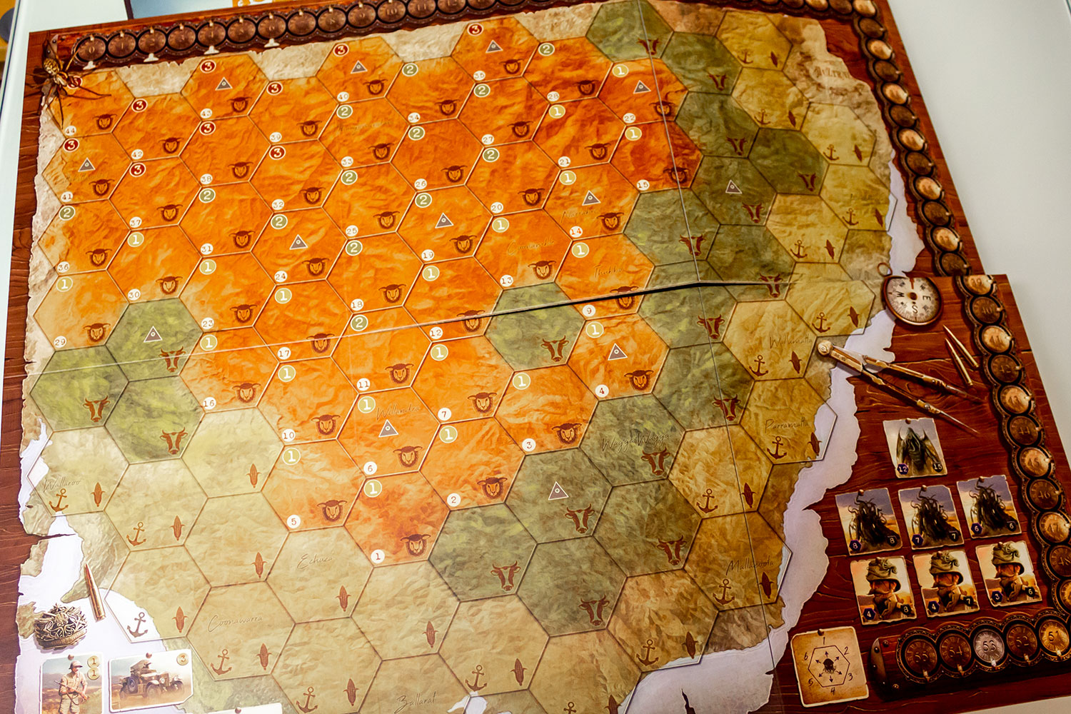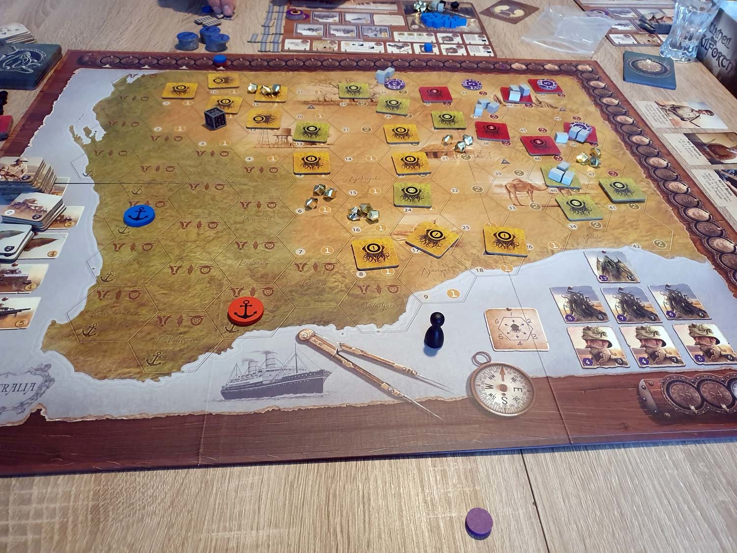 „AUZTRALIEN“ hat mich und meine Spielergruppe ganz schön auf Trapp gehalten. Wir hatten dieses Brett nun fast eine ganze Woche jeden Abend auf dem Tisch und konnten nur eine kleine Auswahl von Spielvarianten ausprobieren. Die Möglichkeiten, dieses Spiel zu spielen, sind dabei wirklich sehr unterschiedlich und bedürfen teilweise auch spontane Taktikanpassungen, um nicht direkt überrannt zu werden. Die Kritik, die man sonst über dieses Spiel hört, zum Beispiel, dass es für 2-Spieler nicht geeignet sein soll, wurde vom Verlag aufgenommen und mit dem Zwei-Spieler-Modus und dem zweiten Spielfeld umgesetzt. Das funktioniert tatsächlich ganz gut. Wichtig ist aber, dass es sehr auf die Spieler dieses Spiels ankommt, ob wirklich jeder damit Spaß haben wird. Erfahrene Spieler können, wie es bei vielen Taktikspielen nun einmal der Fall ist, den Boden mit jedem Neuling wischen, indem sie ihre ausgeplante Strategie verfolgen oder den besten Platz für ihren Hafen wählen. Es liegt daher an den SpielerInnen dies mit verschiedenen Varianten, zum Beispiel den kooperativen Modus, auszugleichen. Bei unseren Runden ist mir jedoch aufgefallen, dass es ein bestimmtes Startfeld gibt, durch das das Spiel unausgeglichen wird. Mein Tipp ist daher, das Feld „Coonawarra“ auf der Ost-Australien-Karte einfach als Hausregel zu streichen.