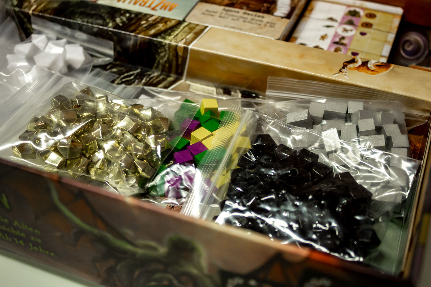 Trotz dieser Vielzahl an verschiedenen Markern und Plättchen ist die Box an sich jedoch nicht unordentlich. Durch eine eingebaute Papiereinlage lassen sich die Materialien gut ordnen. Besonders ist die Vielzahl von vorhandenen Tütchen hervorzuheben, die wirklich alles separat eintüten lässt (es sind sogar genug Tüten da, um die Tüten einzutüten!).