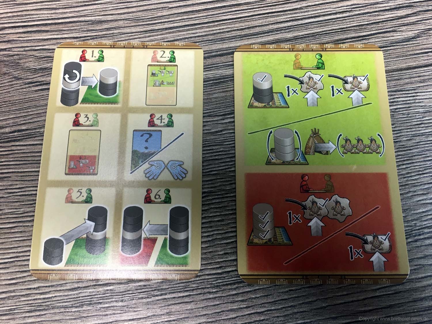 Das Spielmaterial finde ich wunderschön. Die kleinen Indianermeeples, der toll aussehende Totempfahl mit dem Adlerkopf an der Spitze, die Spielbretter mit den Landschaftsfeldern und Visionspfaden sowie die Ressourcen sind alle sehr schön illustriert und liebevoll gestaltet.