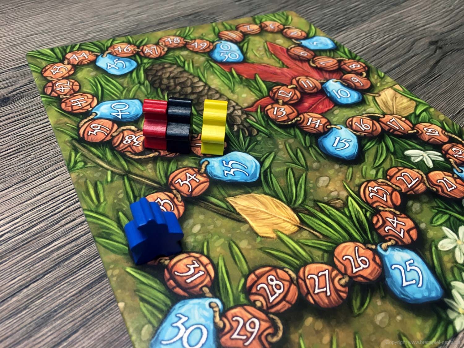 Als Punkteanzeiger wird eine der Indianer‑Spielfiguren verwendet, die leider etwas zu groß für die Felder der Siegpunkte‑Tafel ist. Vor allem wenn sich mehrere Spieler ein Feld teilen müssen, kann es unübersichtlich werden.