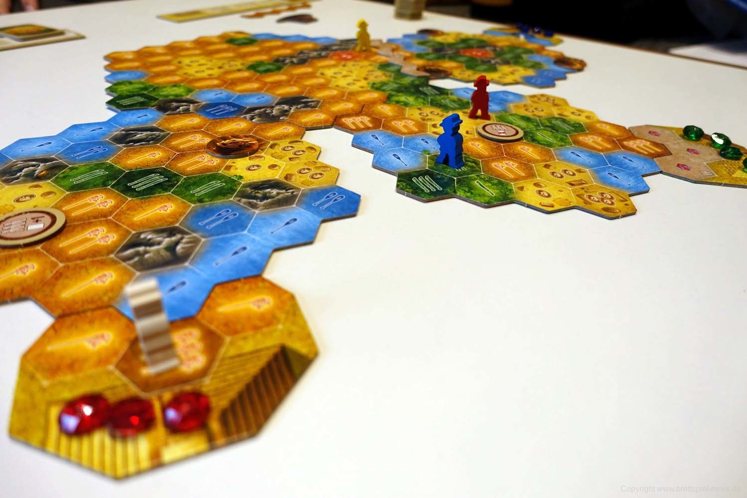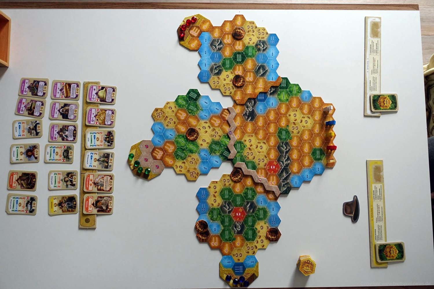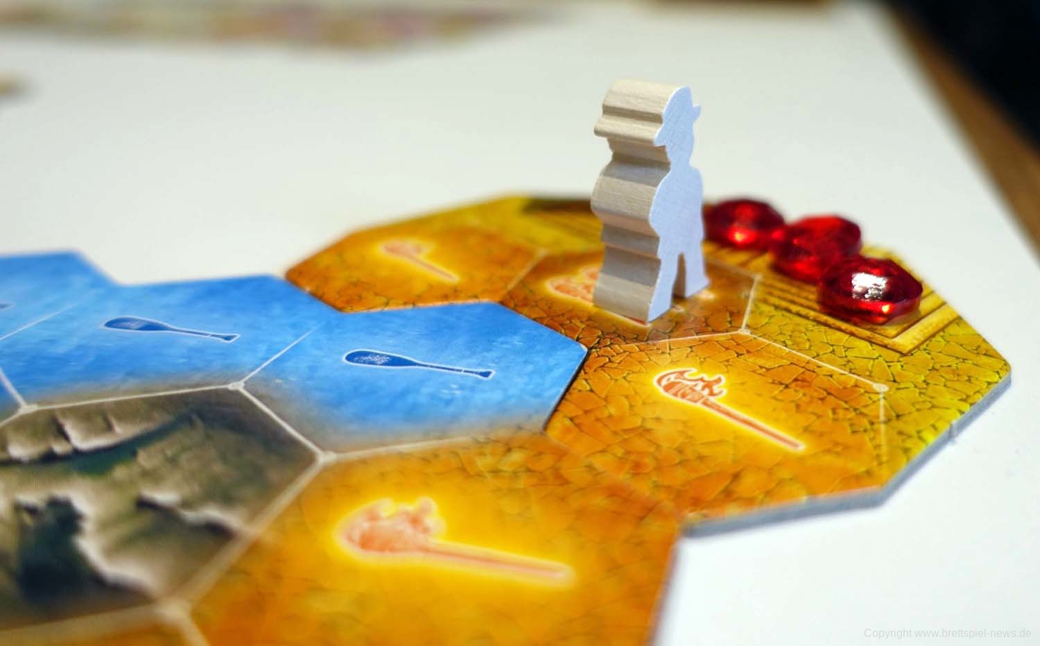 Da das Spiel bis hierhin noch recht simpel ist, gibt es 3 kleine Mechaniken, um den Abenteurern das Leben schwer zu machen. Zum einen wären da die Blockaden zu nennen, die sich an den Übergängen von einem Spielplanplättchen auf das nächste befinden. Diese müssen überwunden werden, um voran zu kommen. Das hat allerdings seinen Preis, der entweder mit dem Ablegen von Karten zu bezahlen ist oder den Konkurrenten einen Vorteil verschafft. Doch das sollte niemanden davon abschrecken, die Barrieren zu entfernen, denn falls zu Spielende Gleichstand herrscht, werden entfernte Barrieren in die Wertung miteinbezogen. Ein zweites Spielelement sind Goldmünzen. Jede/r SpielerIn kann maximal 3 davon besitzen. Sie können zum Kartenkauf verwendet werden, sind jedoch essenziell, da es Stellen gibt, welche nur durch das Einsetzen einer solchen Goldmünze passiert werden können. Um diese begehrte Währung zu erhalten, dürfen einen Spielzug lang weder die Spielfigur bewegt noch Karten vom Markt gekauft werden. Als letztes sind noch die Wächter zu nennen, welche auf vorgegebenen Feldern des Spielplans liegen. Sie sind verdeckt und werden aktiviert, sobald an ihnen vorbeigezogen wird. Entweder lauern darunter Vorteile für die Konkurrenz oder Nachteile für alle.