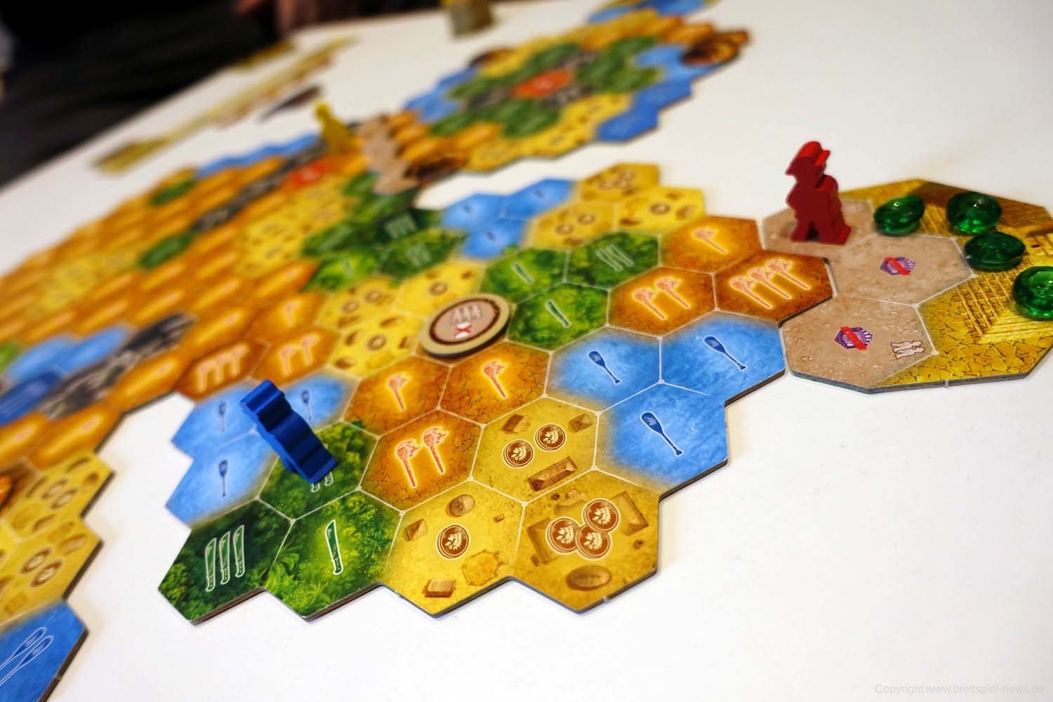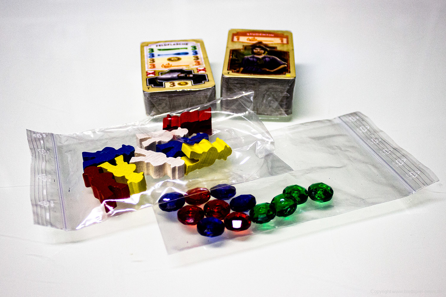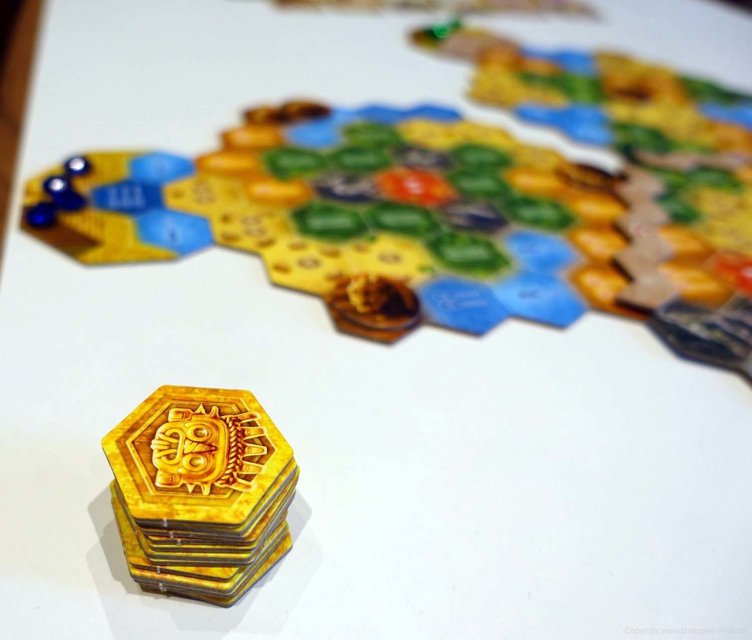 Da das Spiel bis hierhin noch recht simpel ist, gibt es 3 kleine Mechaniken, um den Abenteurern das Leben schwer zu machen. Zum einen wären da die Blockaden zu nennen, die sich an den Übergängen von einem Spielplanplättchen auf das nächste befinden. Diese müssen überwunden werden, um voran zu kommen. Das hat allerdings seinen Preis, der entweder mit dem Ablegen von Karten zu bezahlen ist oder den Konkurrenten einen Vorteil verschafft. Doch das sollte niemanden davon abschrecken, die Barrieren zu entfernen, denn falls zu Spielende Gleichstand herrscht, werden entfernte Barrieren in die Wertung miteinbezogen. Ein zweites Spielelement sind Goldmünzen. Jede/r SpielerIn kann maximal 3 davon besitzen. Sie können zum Kartenkauf verwendet werden, sind jedoch essenziell, da es Stellen gibt, welche nur durch das Einsetzen einer solchen Goldmünze passiert werden können. Um diese begehrte Währung zu erhalten, dürfen einen Spielzug lang weder die Spielfigur bewegt noch Karten vom Markt gekauft werden. Als letztes sind noch die Wächter zu nennen, welche auf vorgegebenen Feldern des Spielplans liegen. Sie sind verdeckt und werden aktiviert, sobald an ihnen vorbeigezogen wird. Entweder lauern darunter Vorteile für die Konkurrenz oder Nachteile für alle.