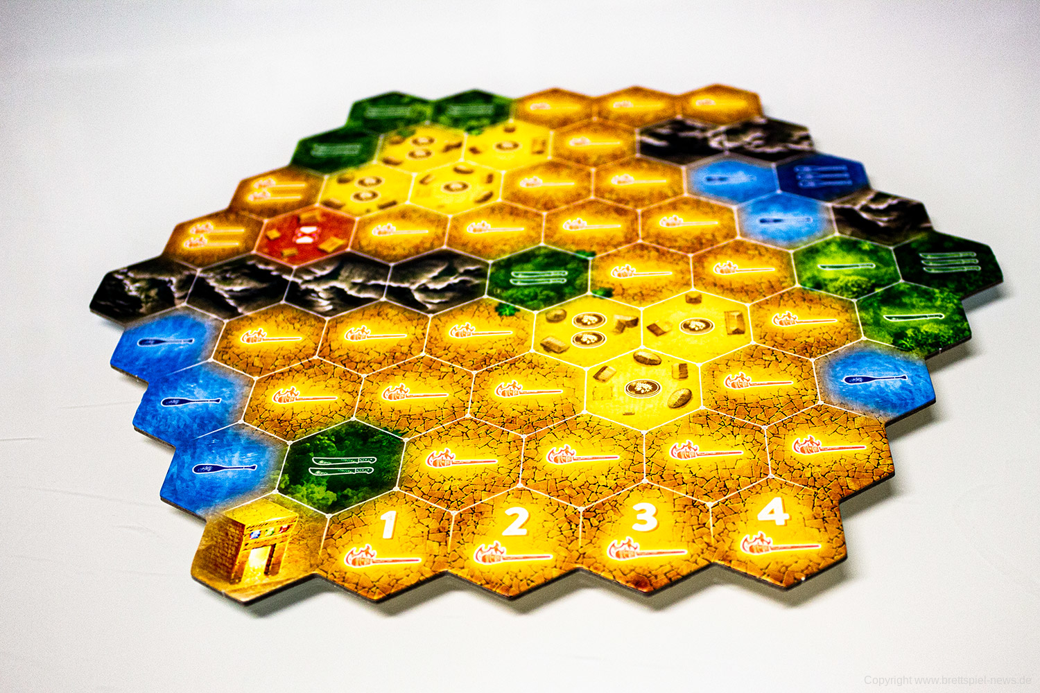WETTLAUF NACH EL DORADAO - DIE GOLDENEN TEMPEL glänzt mit hochwertigem Spielmaterial. Sowohl der Spielplan als auch die Markttafel sind aus Karton und sehr gut bedruckt. Das Design ist ansprechend und passend zum Thema. Auch die Expeditionskarten sind sehr schön anzusehen und mit Liebe zum Detail gestaltet. Leider sind sie etwas kleiner als normale Spielkarten und somit etwas schwieriger in der Handhabung. Auch die Schachtel sieht hübsch aus, jedoch ist kein Sortiersystem vorhanden, stattdessen muss mit Zip-Beuteln nachgeholfen werden.
