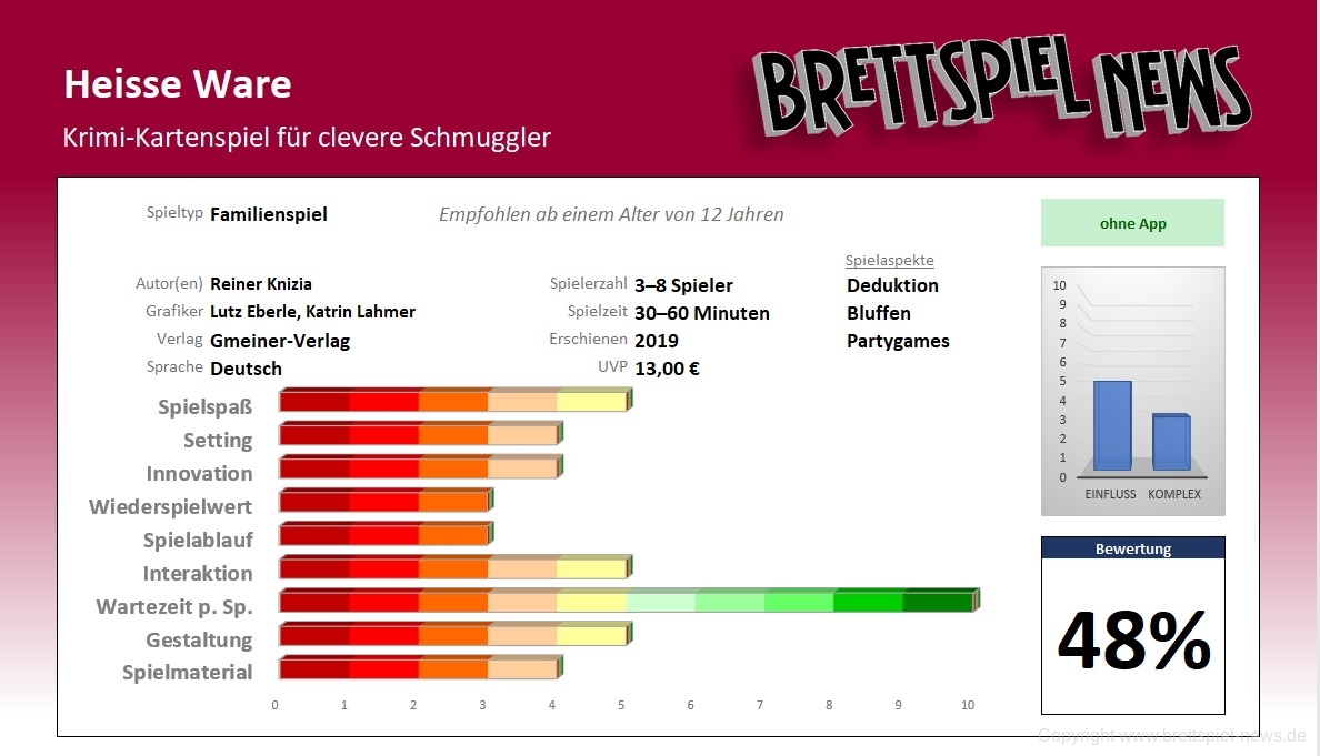 Sobald das Spiel erst einmal im Gange ist, entsteht am Tisch recht schnell eine spaßige Konversation. Immer wieder wird sich gegenseitig beschuldigt mit „3 Flaschen zur Bestechung? Du hast sicher beide Koffer randvoll!“ oder „Keine Bestechung? Du willst sicher keine Aufmerksamkeit auf dich ziehen…“. Das sorgt für kurzweiligen Spaß und witzige Situationen! Doch durch den sehr gleichförmigen Spielablauf zieht sich das Spiel gegen Ende (gerade bei hoher Spieleranzahl) und der Wiederspielreiz ist in meinen Augen nicht gegeben. So benötigt man eigentlich stets eine neue Spielrunde, um das Spiel wieder auf den Tisch zu bringen.