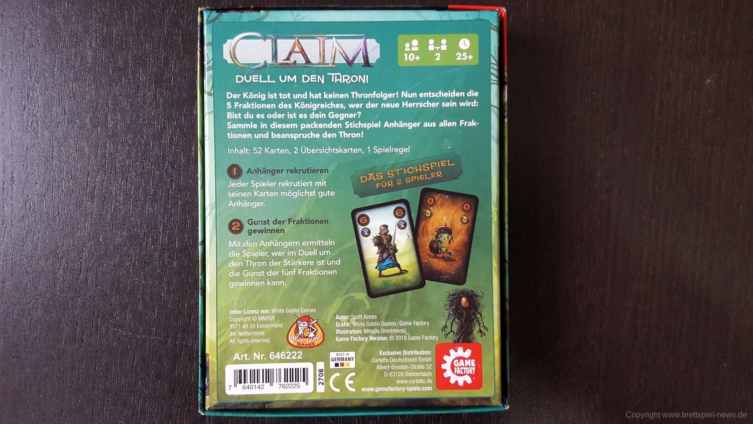 Das Spiel steckt in einer kleinen 10x13cm großen Kartenspielschachtel und beinhaltet 52 Spielkarten + 2 Übersichtskarten für die Fraktionen und die Spielregeln. Ungewöhnlich für ein Kartenspiel ist das kleine Inlay, was dafür sorgt, dass nichts lose in der Schachtel herumfliegt. Alle Karten sind in Leinenqualität und „black bordered“, haben also einen schwarzen Rahmen statt des gängigen weißen, was den Illustrationen zu gute kommt. Über die Qualität der Illustrationen sagt der Platz auf der Garf-Ludo-Auswahlliste eigentlich genug aus. Es hätten genau so gut einfarbige Karten mit einer Zahl drauf sein können, wie in unzählbaren anderen Kartenspielen auch. Das hätte aber nicht dieses witzige Spielgefühl transportiert, welches CLAIM beinhaltet. Die Regeln sind leicht verständlich mit vielen bebilderten Beispielen und farblich hervorgehobenen Textstellen.
