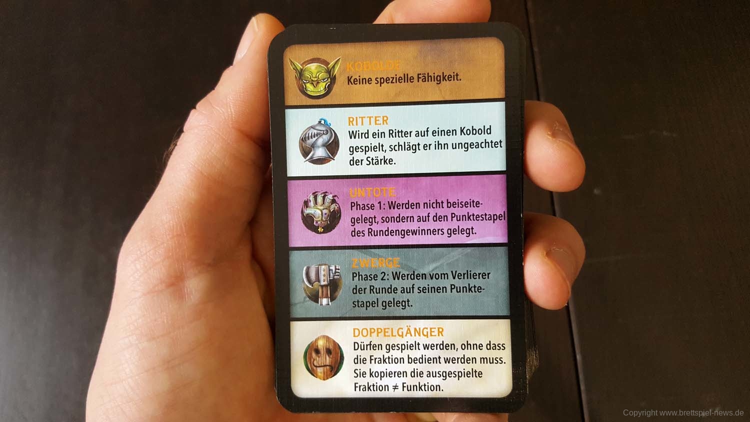 Kobolde haben keine Sonderfertigkeiten, dafür sind sie die einzige Fraktion, die mehr als eine Karte mit dem Wert 0 aufweist. Die Werte der Ritter beginnen bei 2 und sie haben die Fähigkeit, Kobolde jeden Werts zu schlagen. Sollte ein Kobold bedient werden müssen, hat der Spieler aber keine mehr auf der Hand, kann es sich lohnen, einen Ritter in den Kampf zu schicken.