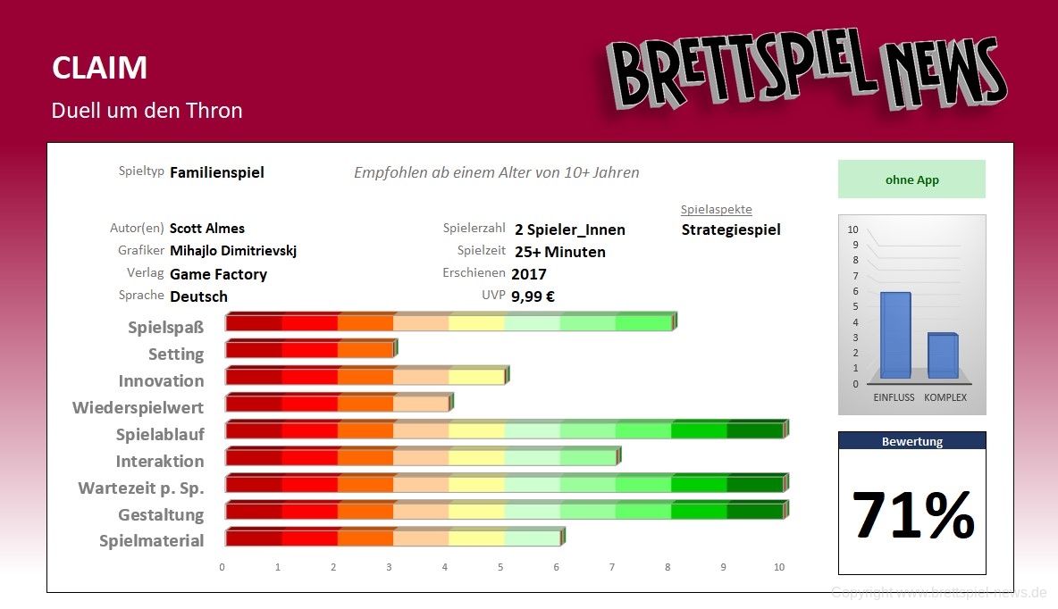 CLAIM ist kein grübellastiger Strategiehammer, sondern eine schöne Mischung aus kleinen taktischen Abwägungen und einer Portion Kartenglück. Was ich an diesem Spiel besonders gut finde ist, dass es sich nicht abnutzt, wie andere Spiele, die nach den ersten drei Partien gefühlt komplett erkundet sind, sondern von Partie zu Partie interessanter wird. Die erste Phase des Spiels mag anfänglich wie ein reines Glücksspiel wirken, aber nach einigen Partien merkt man doch, dass man das Schicksal hier mehr in der Hand hat als angenommen.