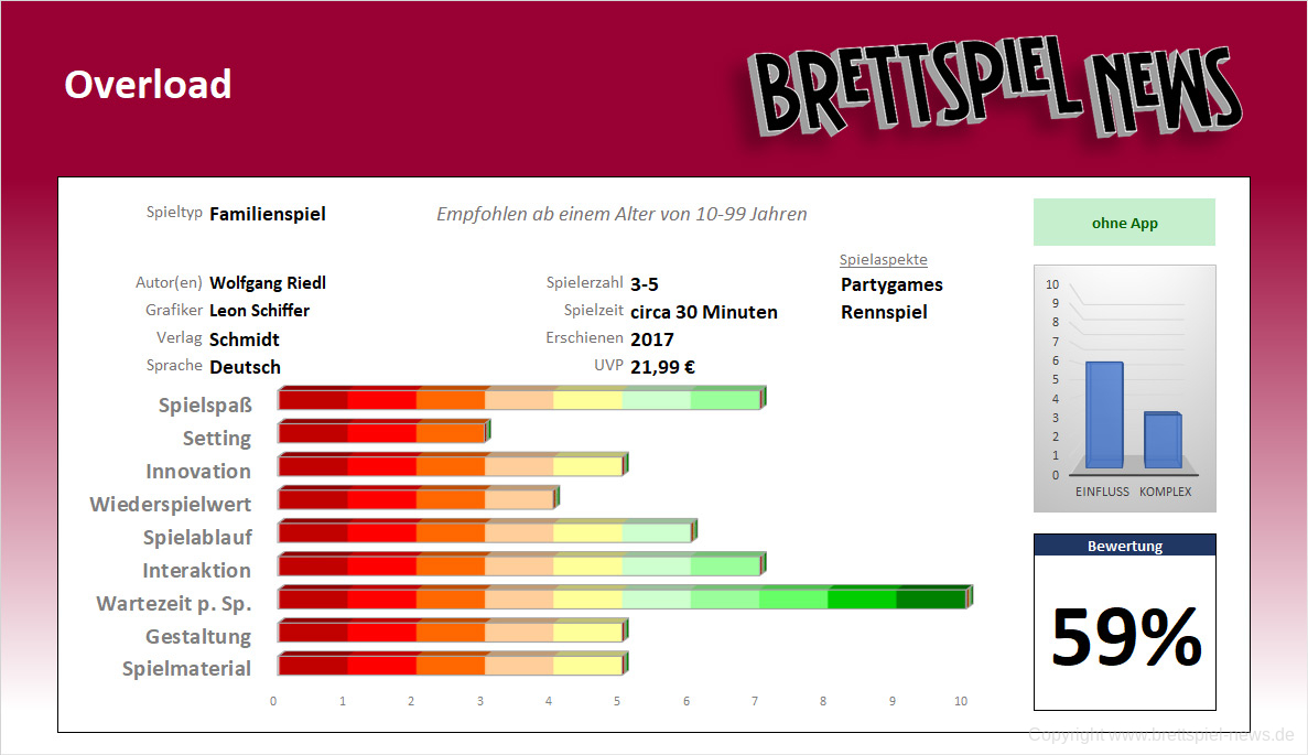 Das Spiel erinnert an „Mensch ärgere dich nicht“, wenn der Spieler kurz vorm Ziel „überladen“ wird und damit wieder von vorne anfangen muss. So ist es ein unvorhersehbares und abwechslungsreiches Spiel, was für ein kurzes Intermezzo gut geeignet ist. Auch wenn es möglich ist, einige taktische Züge zu machen, ist es kein strategisches Gesellschaftsspiel. Ich würde das Spiel eher in die Kategorie Familienspiel einordnen, das sicher für viel Spaß an einem Sonntagnachmittag sorgt. Mir persönlich hat es Spaß gemacht und ich würde es auf alle Fälle wieder spielen… außer ich werde schon wieder kurz vorm Ziel geschlagen…