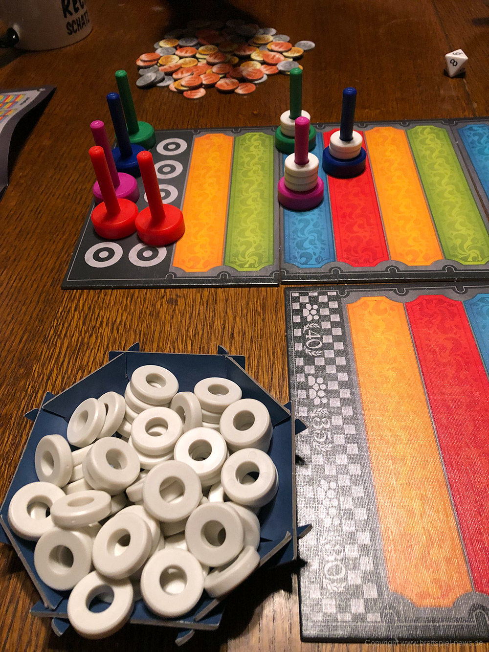 Das Spielmaterial ist im großen und ganzen gut verarbeitet. Leider können die Karten für die Rennstrecke nur aneinander gelegt und nicht gesteckt werden, sodass sie manchmal verrutschen. Bei der Schale für die Chips hätte ich auf eine andere Variante gesetzt. Leider sind die Ecken bereits beim ersten Zusammenstecken beinah abgebrochen. Das Schachtelinlay ist etwas knapp bemessen, das Spielmaterial passt gerade so in die Schachtel. Dank einfacher Regeln und unkompliziertem Aufbau kann das Spiel schnell starten. Durch das Würfeln hat der Spieler keinen Einfluss auf die Anzahl der Schritte. Für jeden Taktikliebhaber ist es machbar, mit der Figur taktisch voranzuschreiten oder sich ein paar Mal überholen zu lassen, um ein paar Extra-Scheiben zu sammeln.