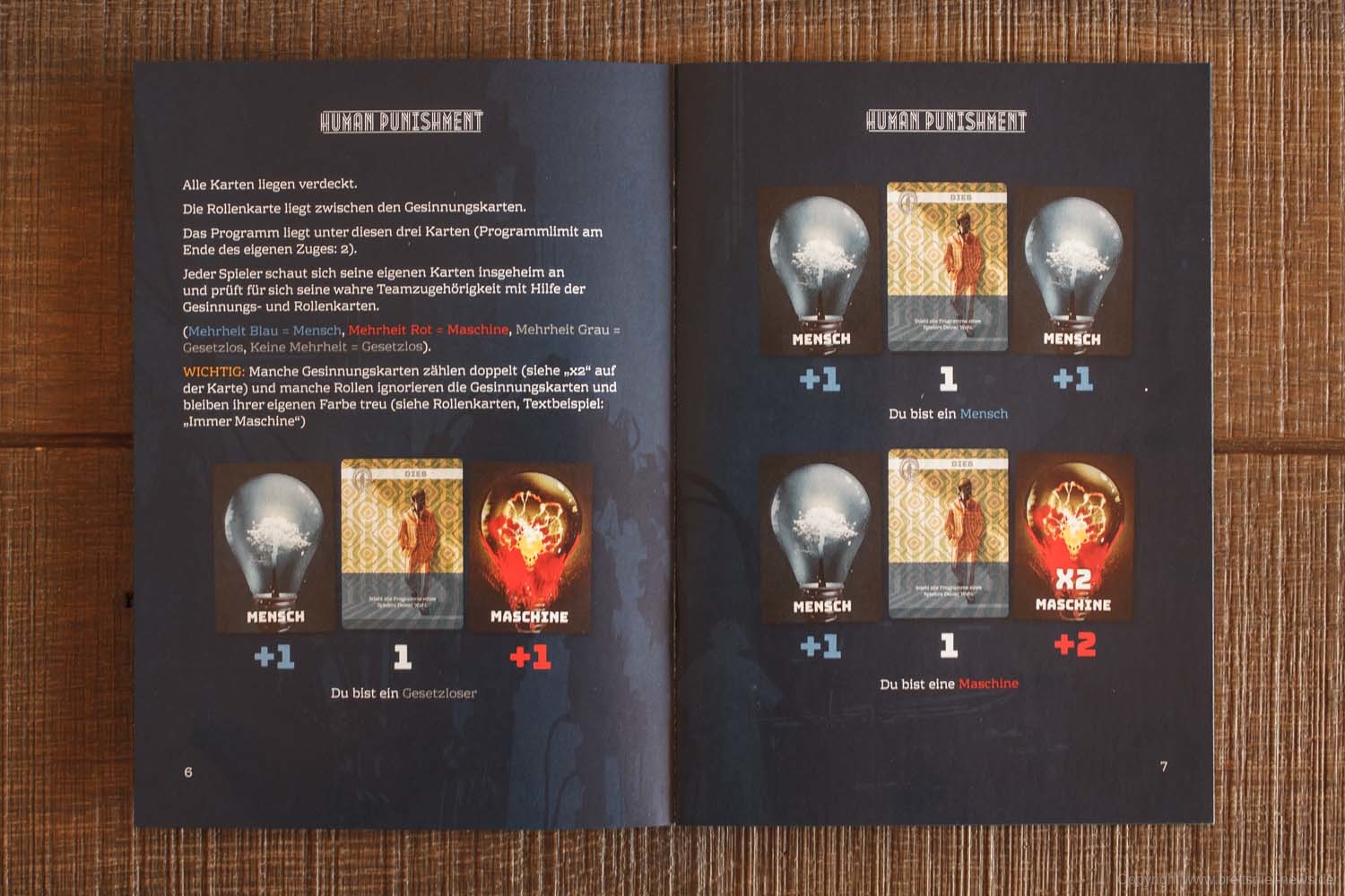 Schauen wir uns nun aber den Untertitel „Social Deduction 2.0“ noch einmal an. Wird es dem denn jetzt gerecht? Nachdem meine Spielergruppen und ich dieses Spiel nun sehr oft gespielt haben, haben wir uns zusammengesetzt und über das Feedback gesprochen. Dabei stach eines sehr schnell hervor: HUMAN PUNISHMENT lässt sich nicht mit anderen Vertretern des Genres in eine Schublade stecken. Durch die verschiedenen Mechaniken, wie KI-Bosse, Programmkarten oder alleine die reine Anzahl an unterschiedlichen Rollen, unterscheidet sich HUMAN PUNISHMENT so stark von bekannten Vertretern wie „Werwölfe vom Düsterwald“ oder „Tempel des Schreckens“, dass ein Vergleich kaum noch möglich ist.