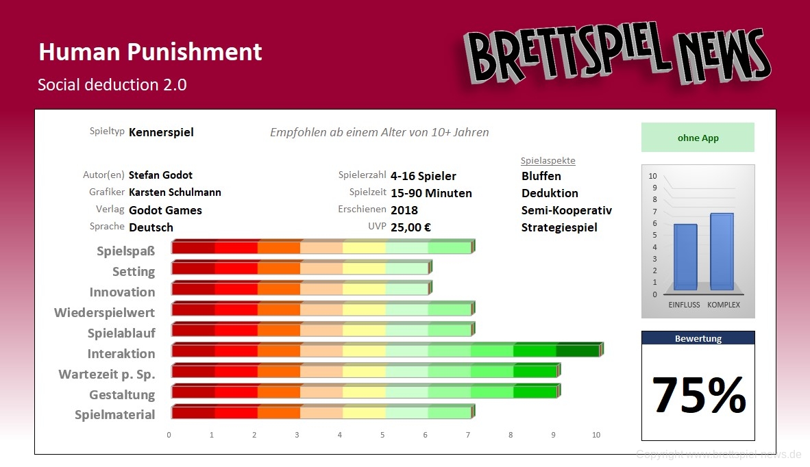 HUMAN PUNISHMENT ist ein richtiges Brett. Die Möglichkeiten, die sich in diesem Spiel entfalten, sind so vielschichtig, dass sich bei jedem neuen Durchlauf ganz unterschiedliche Spielverläufe ergeben. Genau da könnte aber auch ein großes Problem für einige Spielergruppen liegen. Zwar ist das Spielgeschehen für erfahrene Brettspieler sehr leicht zu durchschauen, aber für Gelegenheitsspieler kann es relativ schnell in einer Überforderung enden.