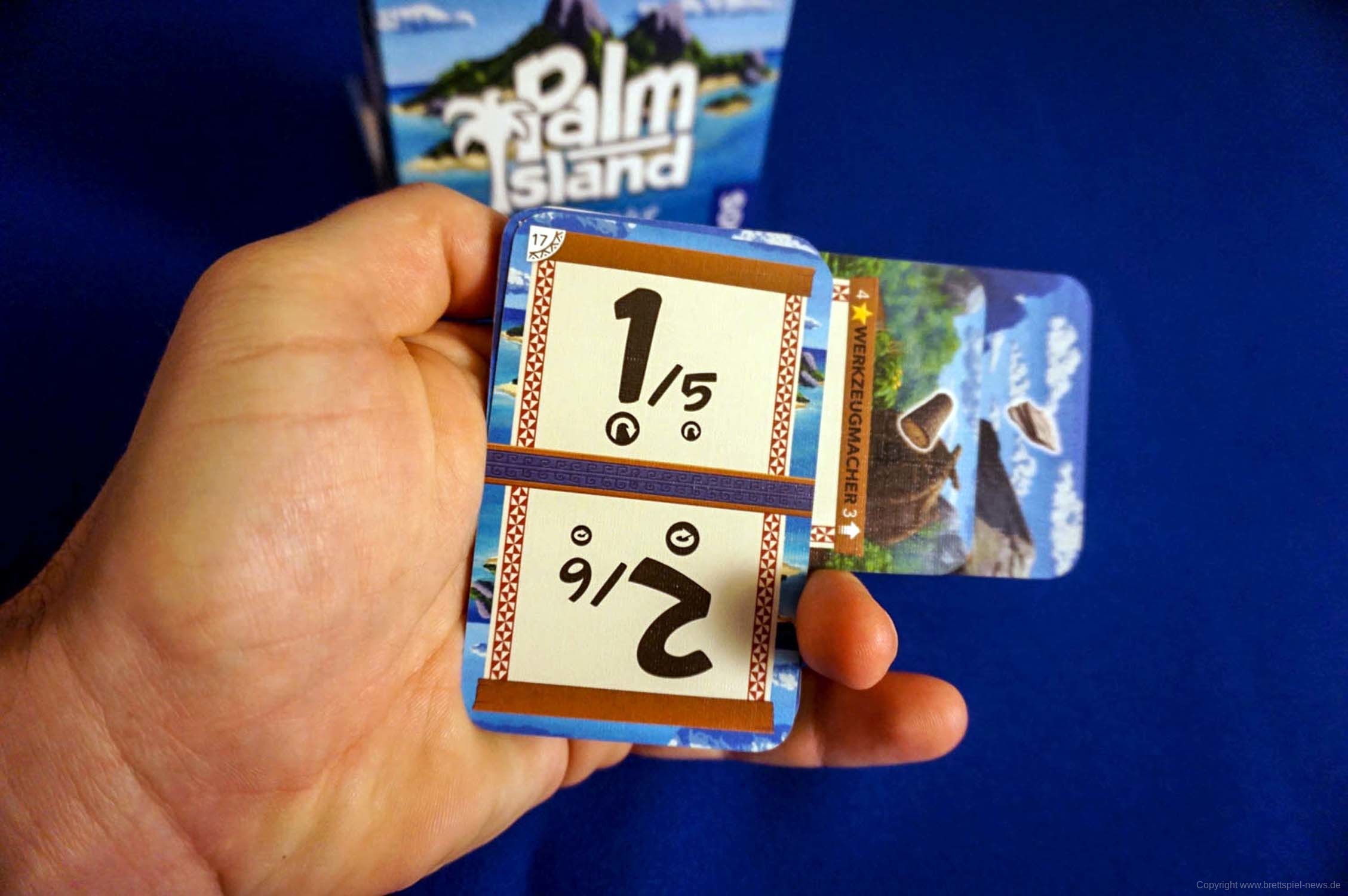 PALM ISLAND ist eins der kleinen Wunderwerke 2019. Begonnen hat alles mit gerade einmal 4800 Unterstützern auf Kickstarter. Dabei handelt es sich um ein 1-2 Personen Kartenspiel, welches solo oder kooperativ gespielt wird. Es besteht lediglich aus zwei Kartendecks á 17 Karten und wird nur in der Handfläche gespielt. Ja! Es wird kein Spieltisch benötigt. Somit lässt es sich in jeder noch so kleinen Ecke spielen und eignet sich gut für das kleine Spielvergnügen unterwegs.
