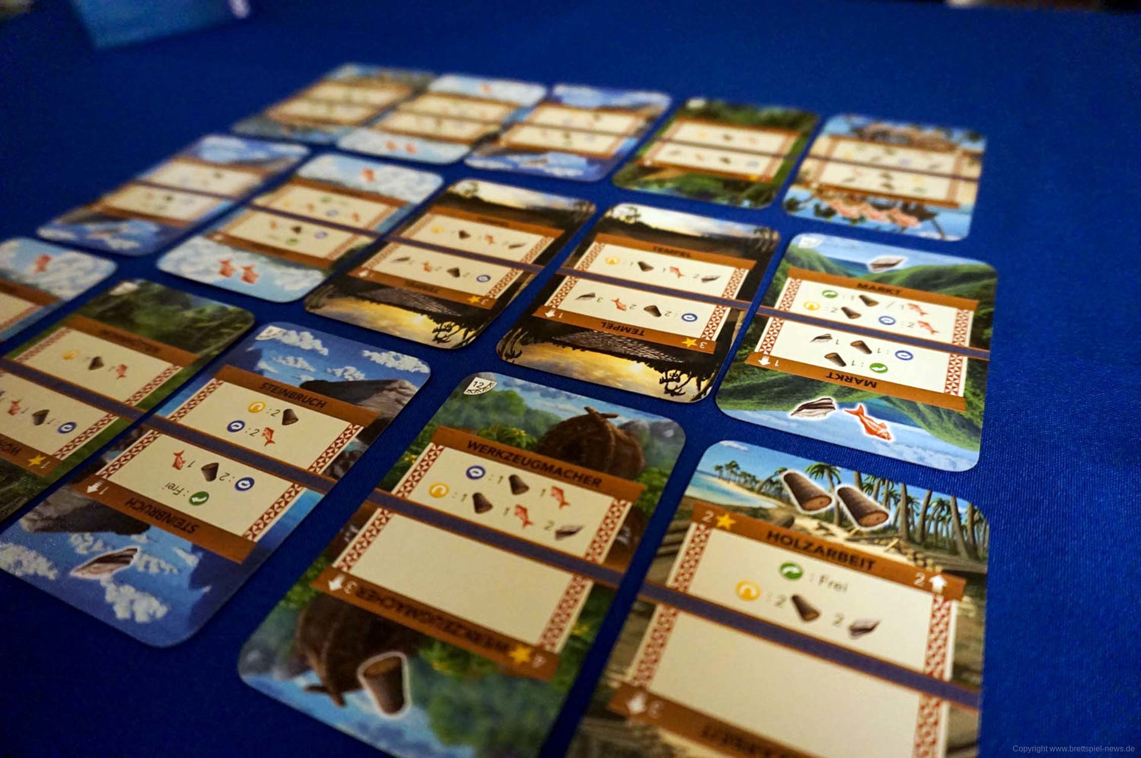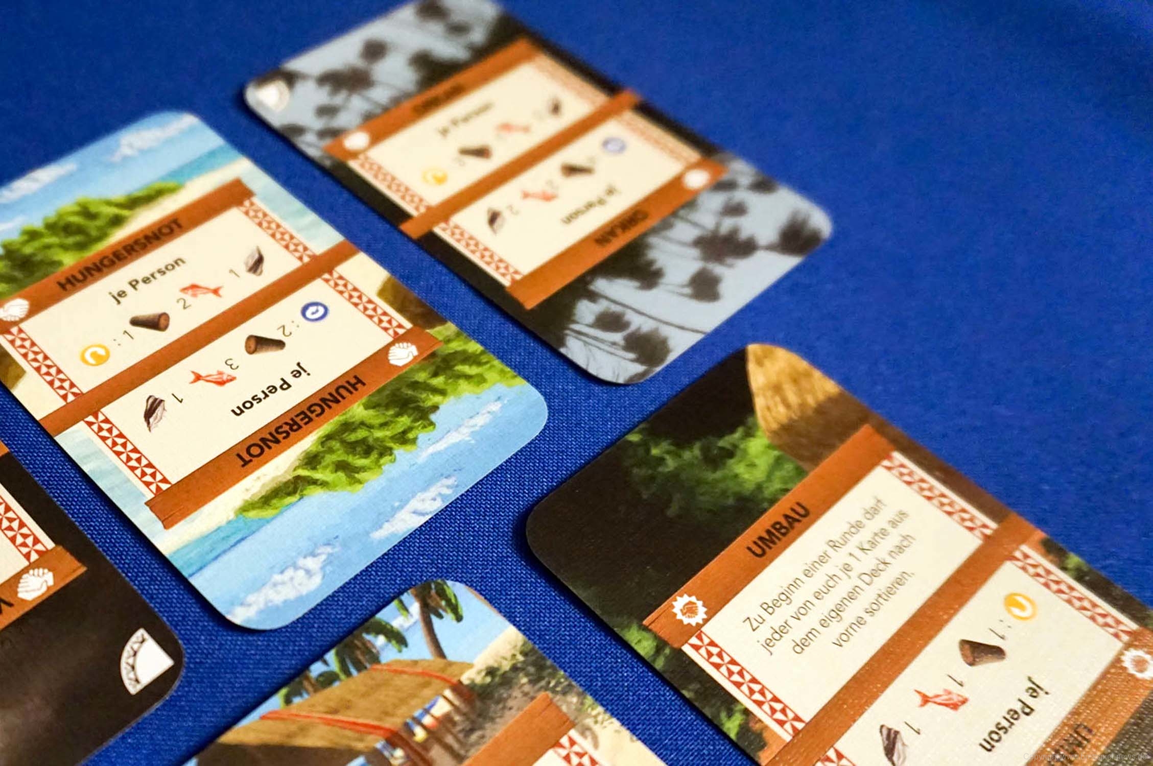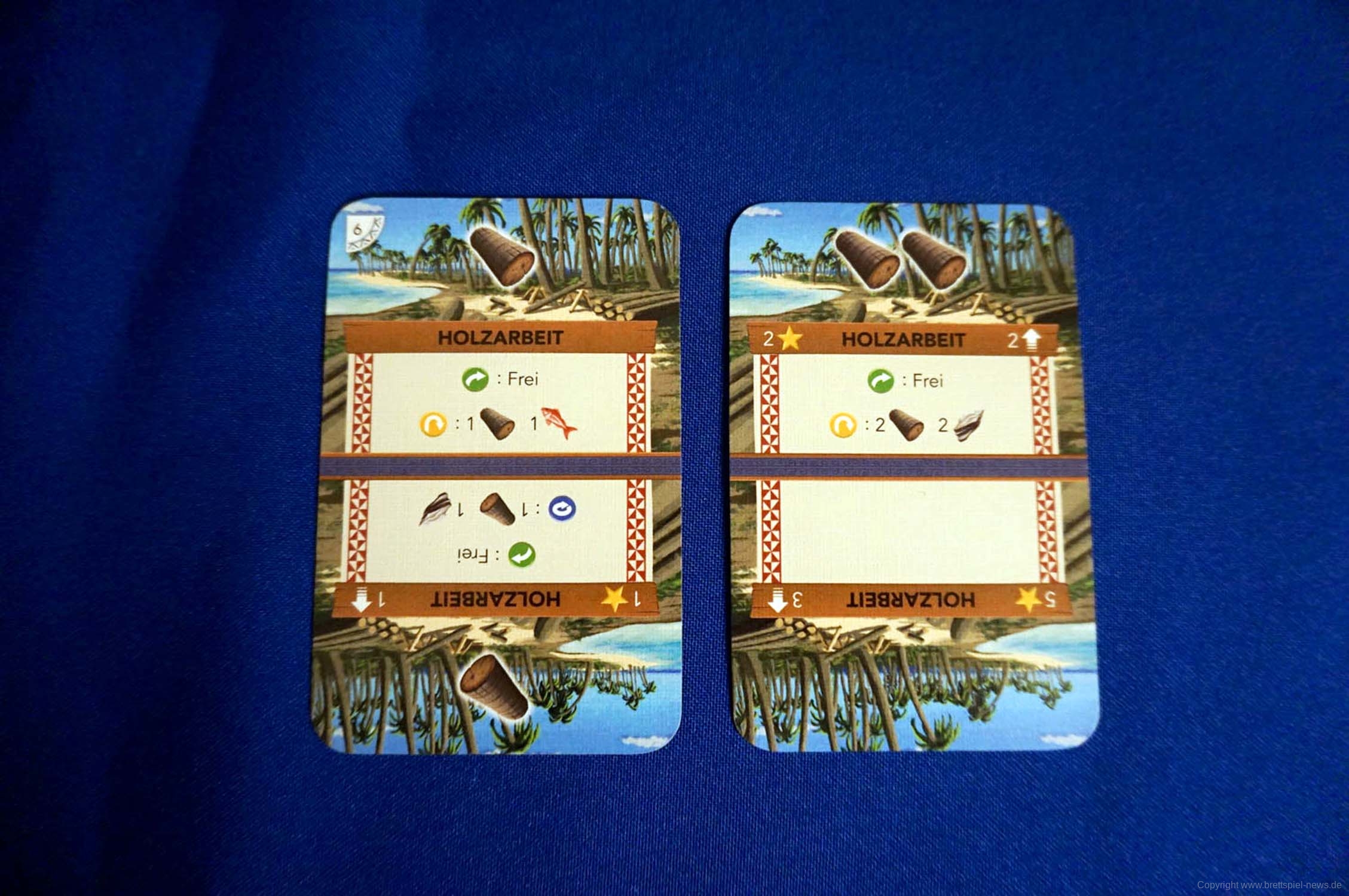 Jede der 17 Karten besitzt vier mögliche Ausrichtungen (zwei auf der Vorder- und zwei auf der Rückseite). Der obere Teil der zu sehenden Karte ist der aktuell aktive Teil und kann im weiteren Spielverlauf aufgewertet werden. Wird eine Karte genutzt, so wird diese nicht ausgespielt, sondern an das Ende deines Decks geschoben. Im aktiven Bereich befinden sich bis zu drei Aktionen und ggf. mögliche Rohstoffe die eingelagert werden können.