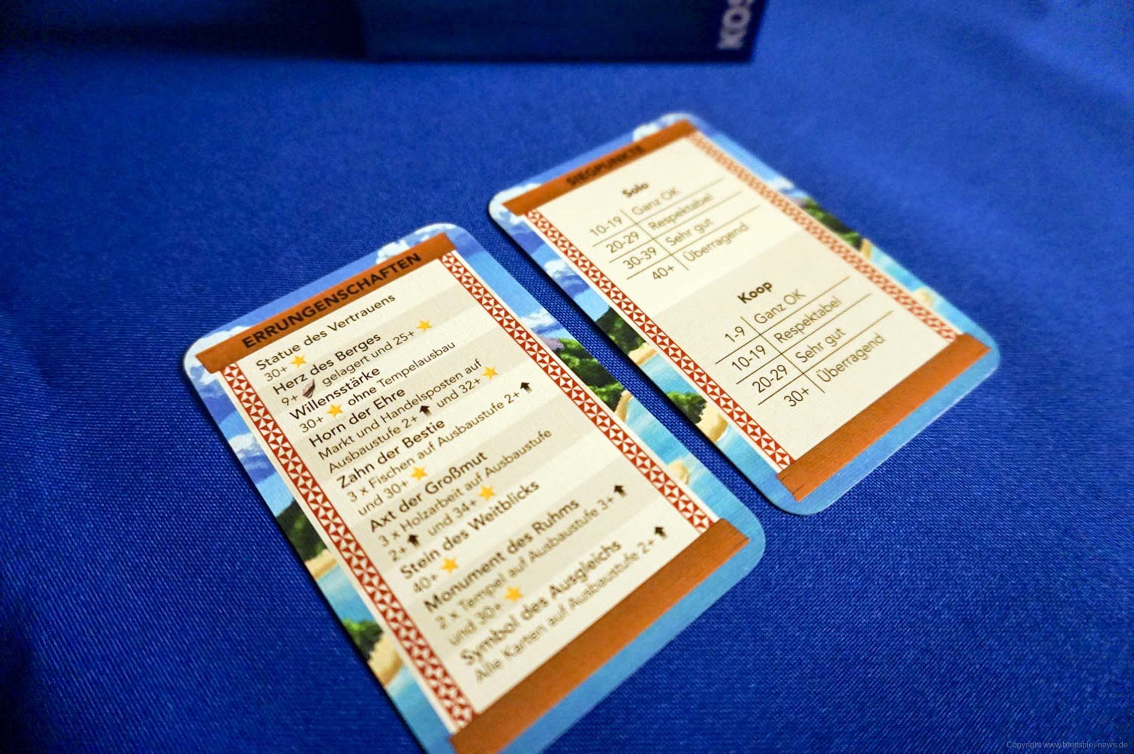 Nach der 8. Runde werden die Siegpunkte auf den Karten zusammenaddiert (kleine Sterne auf der aktiven Seite der Karte) und der Punktestand mit der in der Anleitung abgebildeten Tabelle verglichen. Ab 10 Punkten sind die SpielerInnen keine Vollversager und das Spiel war „Ganz Gut“. Dies kann natürlich noch verbessert werden. Mit 40 oder mehr Punkten hat ein/e Spieler/in ein „Überragendes“ Spiel gespielt.