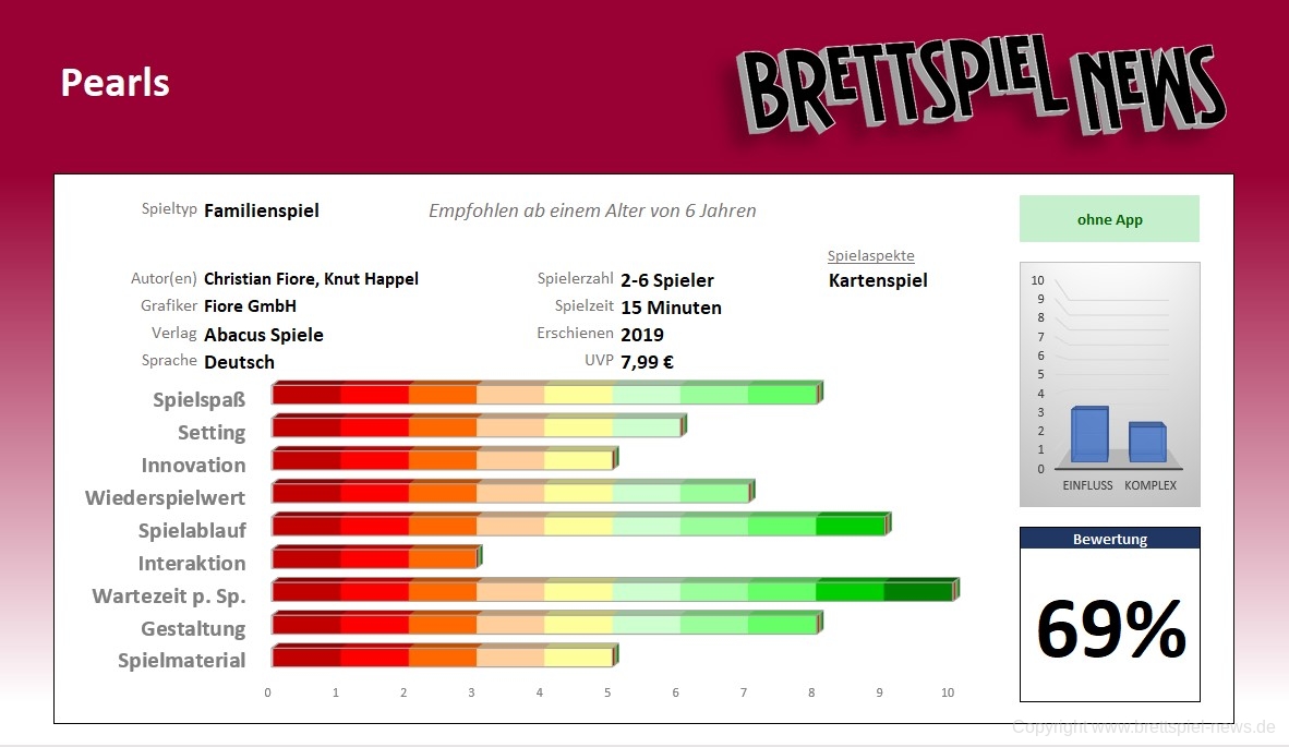 Klein, aber oho: PEARLS überzeugt mit einfachen und einsteigerfreundlichen Regeln, wartet zugleich mit einem schönen Design auf und holt einen durch das Zusammenspiel dieser beiden Komponenten sofort ab. Ein großer Pluspunkt ist außerdem die kurze Spieldauer. Nach spätestens 15 Minuten ist eine der beiden Situationen, durch die die Partie enden kann, eingetreten – das verleitet oftmals dazu, gleich eine zweite oder dritte Runde anzuhängen, in der die eigene Strategie noch verbessert werden kann. Da sich die offen ausliegenden Karten von Zug zu Zug ändern, kann sich auch die Taktik eines/einer jeden Spielers/Spielerin dauernd ändern, was es schwer macht, die Konkurrenten einzuschätzen und seine eigene Taktik konsequent durchzuziehen.