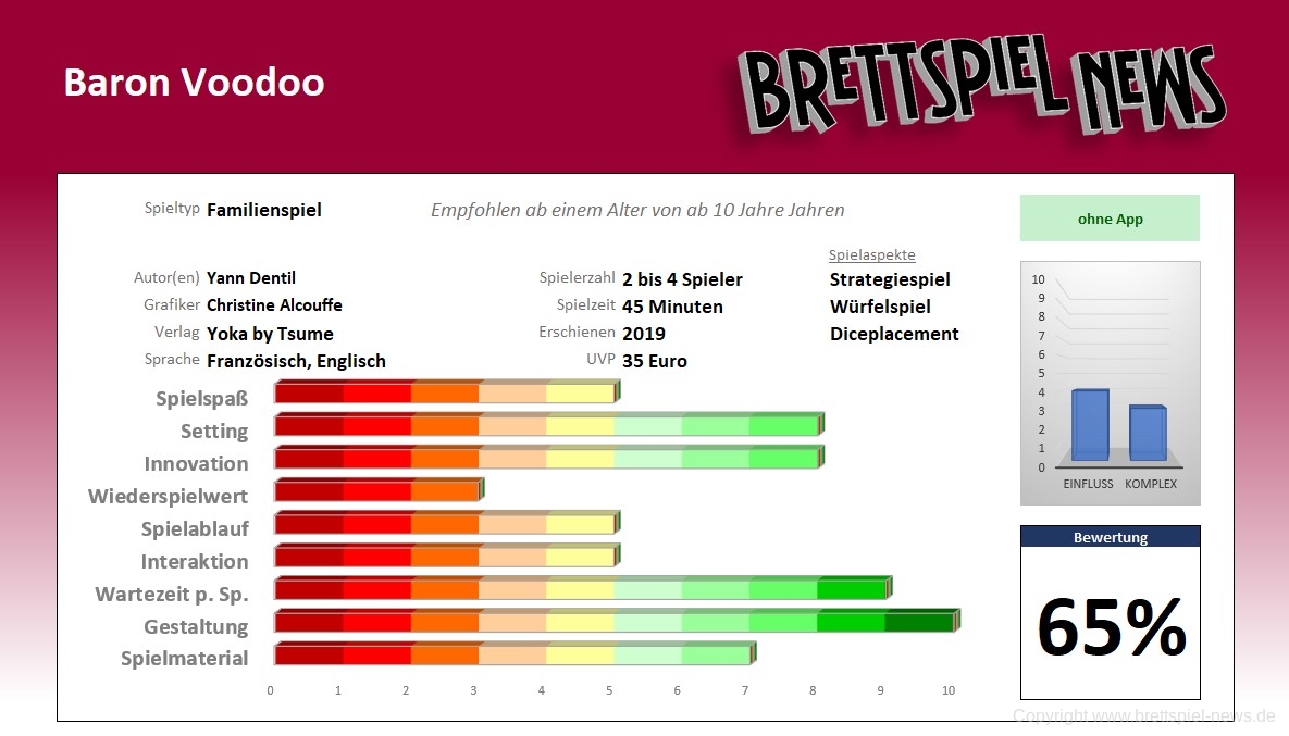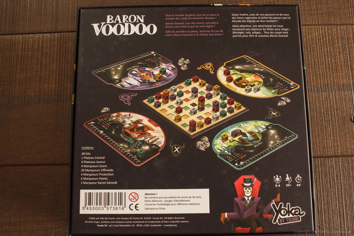 BARON VOODOO ist ein Familienspiel mit einem neuartigen Mechanismus. Die vielen Aktionsmöglichkeiten der Würfel sorgen dafür, dass es kaum möglich scheint, einmal keinen Zug machen zu können. Die Aktionen werden zügig ausgeführt, es kommt nicht zu langen Wartezeiten.