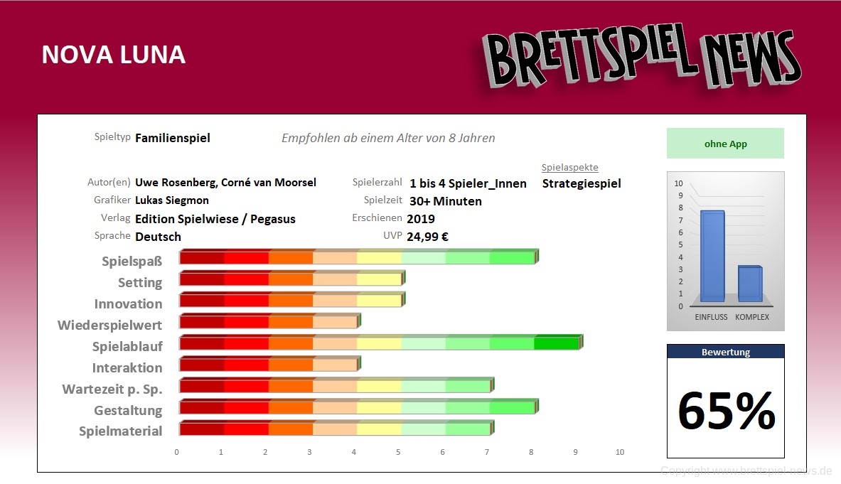 NOVA LUNA kommt auf die Liste: Spiele, die ich mit meiner Mutter spielen würde. Um es in meinen Spielerunden zu spielen, ist es dann doch zu einfach. Zu leicht, um Menschen zu begeistern, die komplexe Strategiespiele mögen, und zu trocken, um ein lustiger Lückenfüller oder Absacker zu sein.