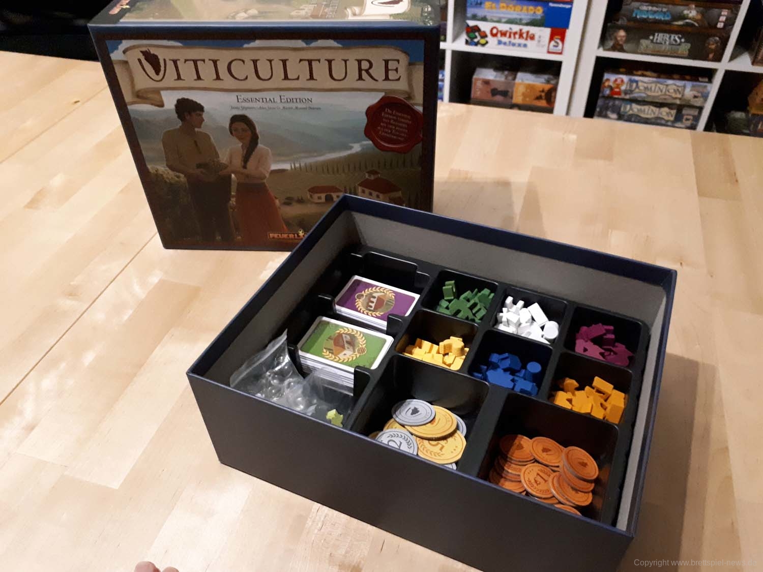 Ein besonderer Hingucker sind die kleinen Glassteine, die zum Anzeigen der Weinwertigkeit genutzt werden. Am Ende des Jahres, wenn die Trauben und der Wein reifen, werden die Glassteine einfach eine Wertigkeit nach oben geschoben. Das ist sehr gut gelöst, weil durch die transparenten Steine hindurch die Zahl auf dem Tableau weiterhin erkennbar ist. So wird der Überblick über die Trauben- und Weinbestände ohne ständiges Anheben der Marker behalten. Die Regeln sind sehr übersichtlich geschrieben und eine zusätzliche kompakte Regelübersicht und ein Glossar für die Karten erleichtern das Spielen zusätzlich.