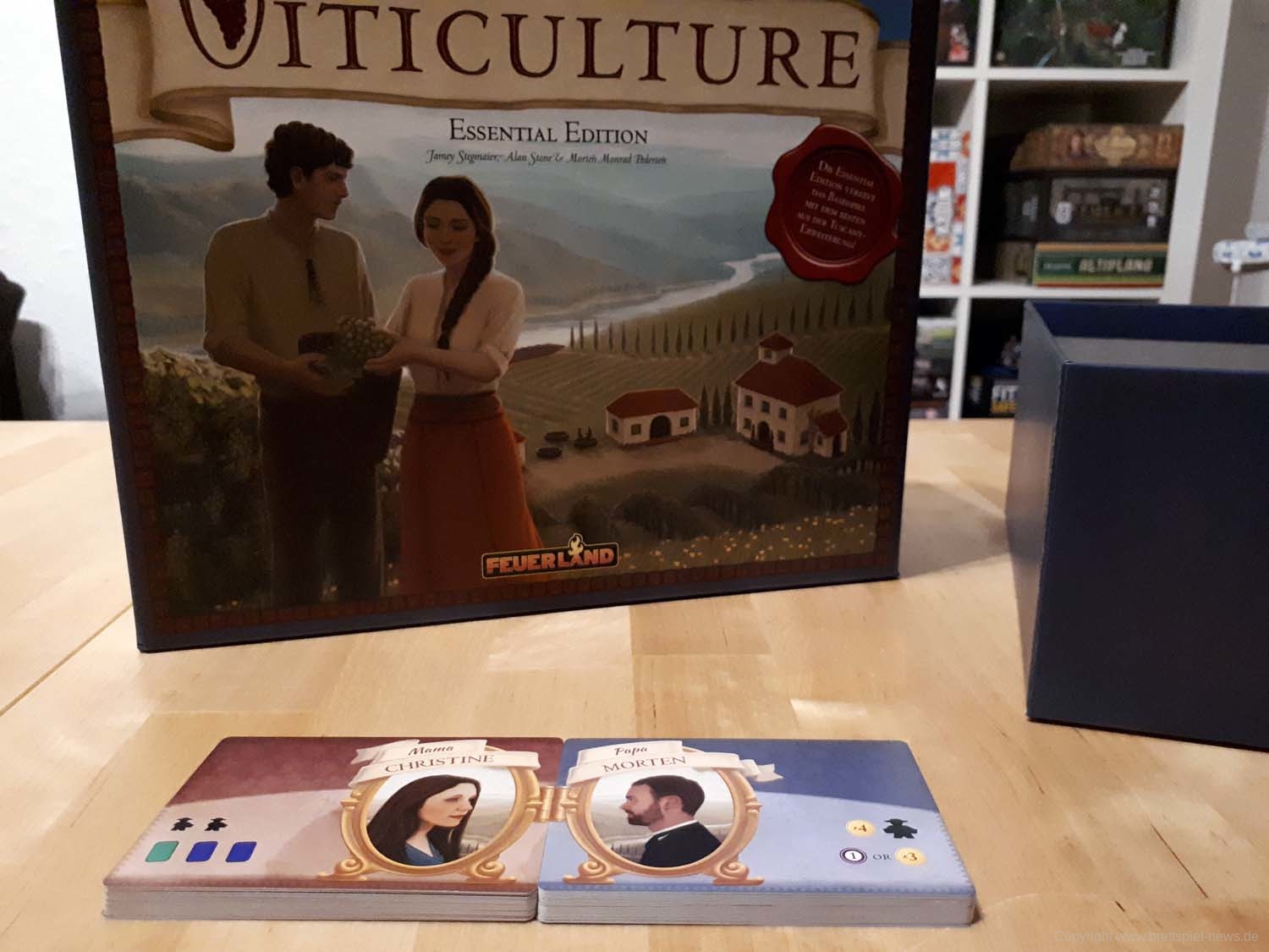 Auch die sogenannten „Mama und Papa“-Karten schaffen einen weiteren Wiederspielreiz. Jeder Spieler bekommt zu Beginn jeweils eine Mama- und eine Papa-Karte. Darauf sind variable Startbedingungen angegeben, die so zufällig kombiniert werden. Es ist zwar keine riesige Asymmetrie, die dadurch entsteht, aber dennoch startet man in keine Partie von VITICULTURE genau gleich.