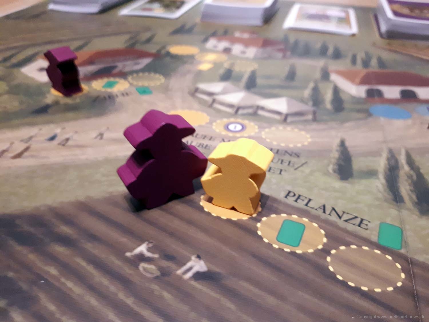 VITICULTURE ist ein Arbeitereinsatzspiel (Workerplacement) und, wie bei diesen Spielen üblich, gilt: Wer als erstes kommt, mahlt zu erst. (Meistens wird der erste an einem Ort sogar noch mit einem Bonus belohnt.) Wenn alle verfügbaren Plätze mit einem Arbeiter belegt sind, kann diese Aktion nicht mehr genutzt werden. Oder doch? Bei VITICULTURE hat jede SpielerIn unter den verfügbaren Arbeitern einen großen Arbeiter. Dieser erlaubt es, sich noch bei einem beliebigen belegten Feld dazuzustellen. Dieser spielerische Kniff kann manchmal sogar spielentscheidend sein.