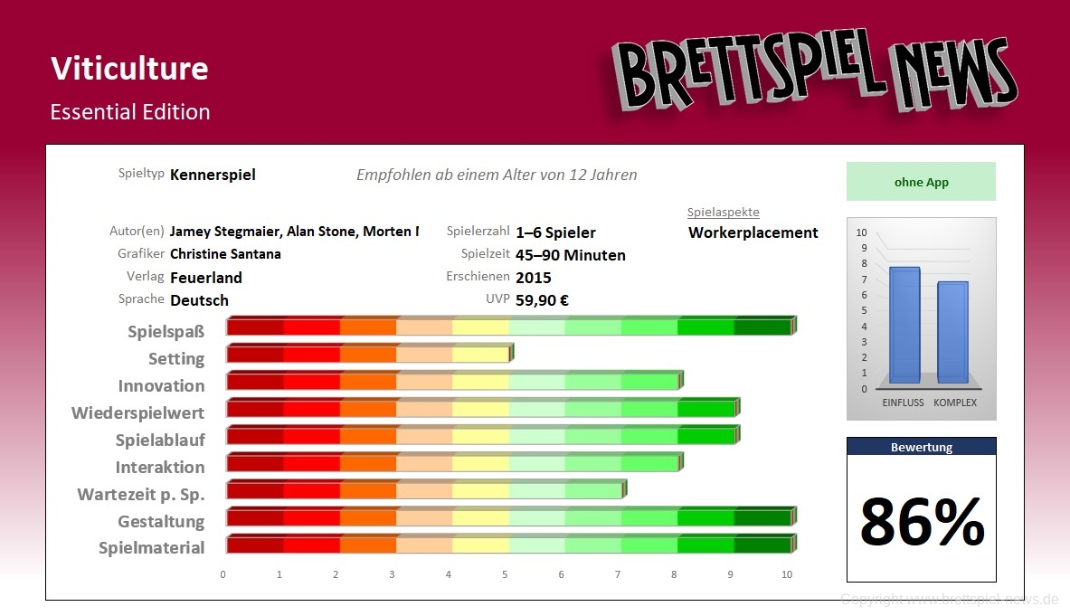 VITICULTURE ist ein optisch wunderschönes und spielmechanisch ausgesprochen rundes Spiel. Das Spiel ist an sich nicht schwer zu erlernen und die eigentlichen Aktionen sind überschaubar. Dennoch entsteht hier eine beachtliche Spieltiefe, die den SpielerInnen einiges an Voraussicht und Flexibilität abverlangt.