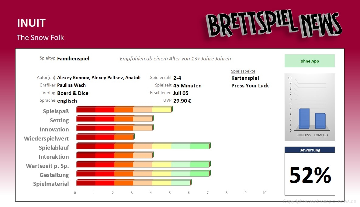 Ich bin froh, INUIT gespielt zu haben. Das Spiel ist sehr einfach und schnell erklärt. Leider verliert es ebenso schnell an Wiederspielwert. Die beiden Module sorgen dafür, dass das Spiel noch weitere zwei Mal den Tisch sehen darf, dann ist die Luft aber auch schon raus und das Spiel würde im Schrank verbleiben, wenn man keine Kritik darüber schreiben müsste…
