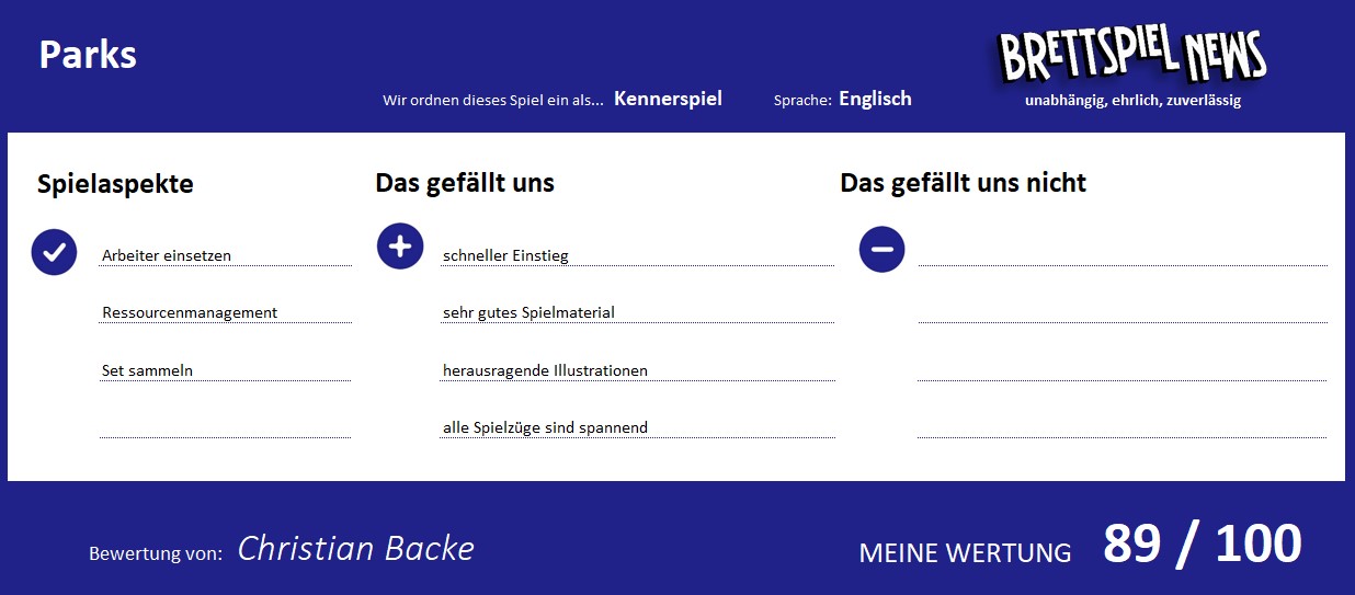 PARKS ist im März 2020 beim Feuerland-Verlag auf Deutsch erschienen. Das hier rezensierte englische Exemplar von Keymaster Games stammt aus meiner eigenen Sammlung. Auf meine Bewertung hatte das natürlich keinen Einfluss.