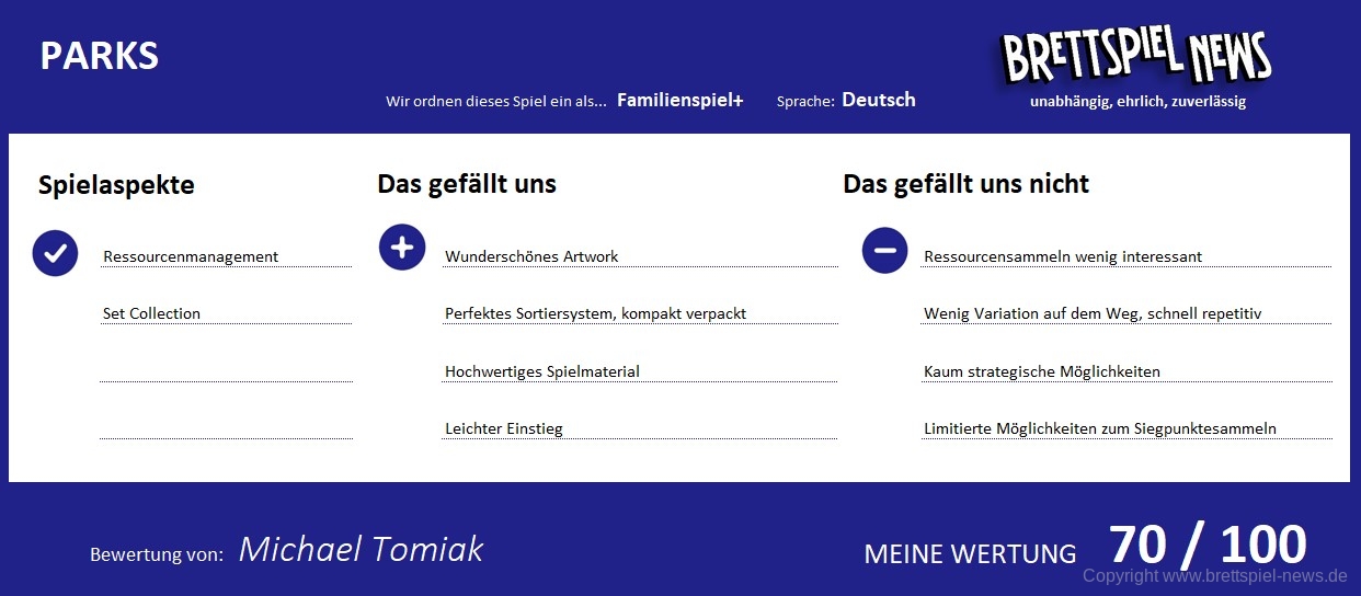 Ich möchte PARKS unbedingt toll finden, möchte unbedingt gerne in die Spielwelt eintauchen. Aber der Funke will einfach nicht überspringen bei mir. So wunderschön das Spiel auch aussehen mag, so erstklassig die Schachtel nebst Sortiersystem und Material auch gefertigt wurde, spielerisch bleibt es einfach viel zu flach für meinen Geschmack. Einige ordnen PARKS als Kennerspiel ein. Leider kann ich diese Meinung nicht teilen. Es ist meiner Meinung nach ein solides Familienspiel Plus. Zu mehr reicht es für mich bei aller Liebe zum Schönen eindeutig nicht.