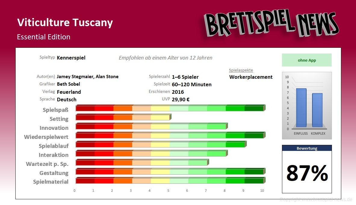 Schon das Grundspiel VITICULTURE ist ein spielmechanisch ausgesprochen rundes Spiel. Durch die TUSCANY Erweiterung erhält es meiner Meinung nach noch einen weiteren Feinschliff. Der neue Spielplan bringt neue Aktionen mit sich, die das gesamte Spiel aufwerten. Nun können SpielerInnen auch Ressourcen durchtauschen.