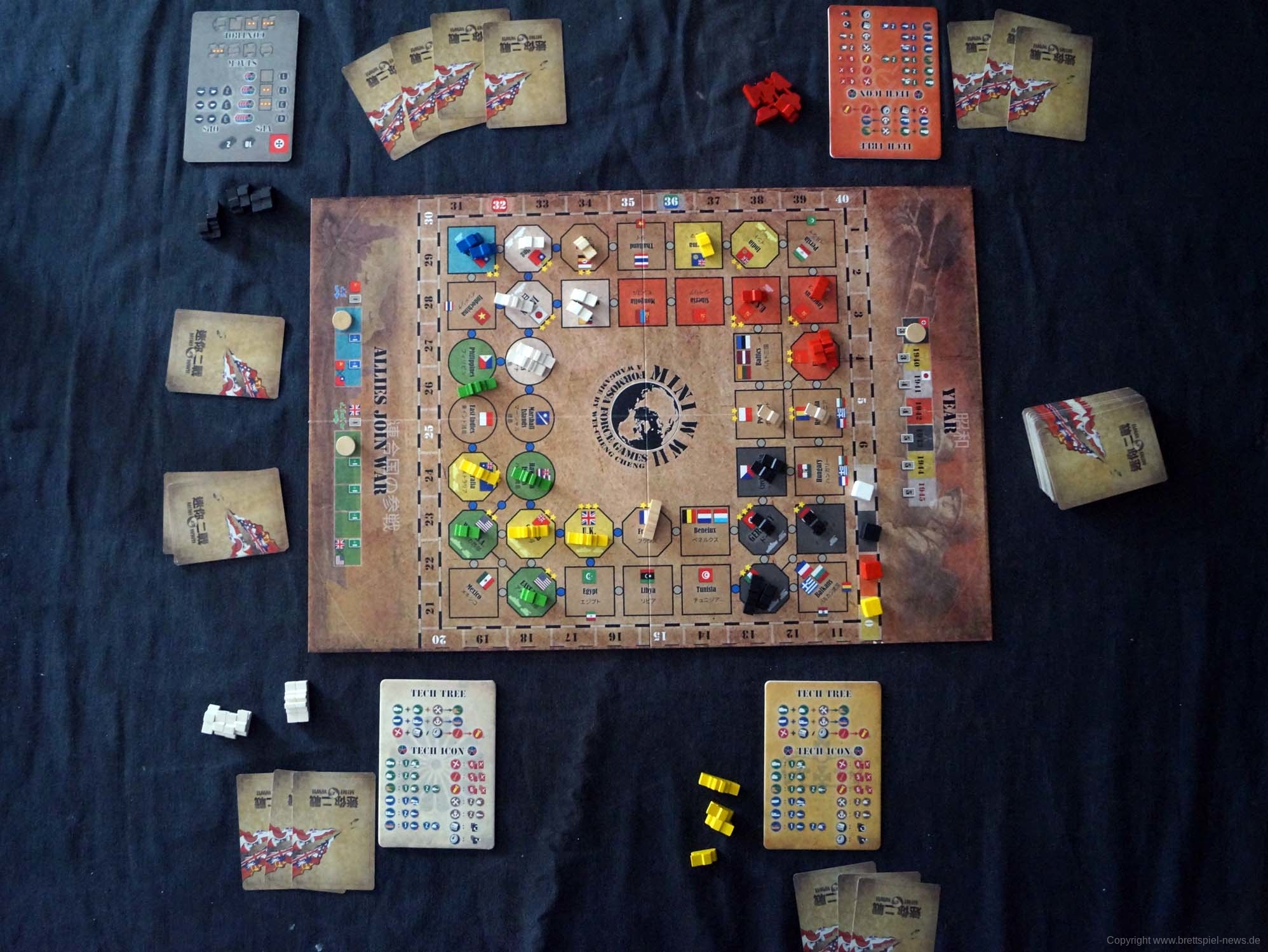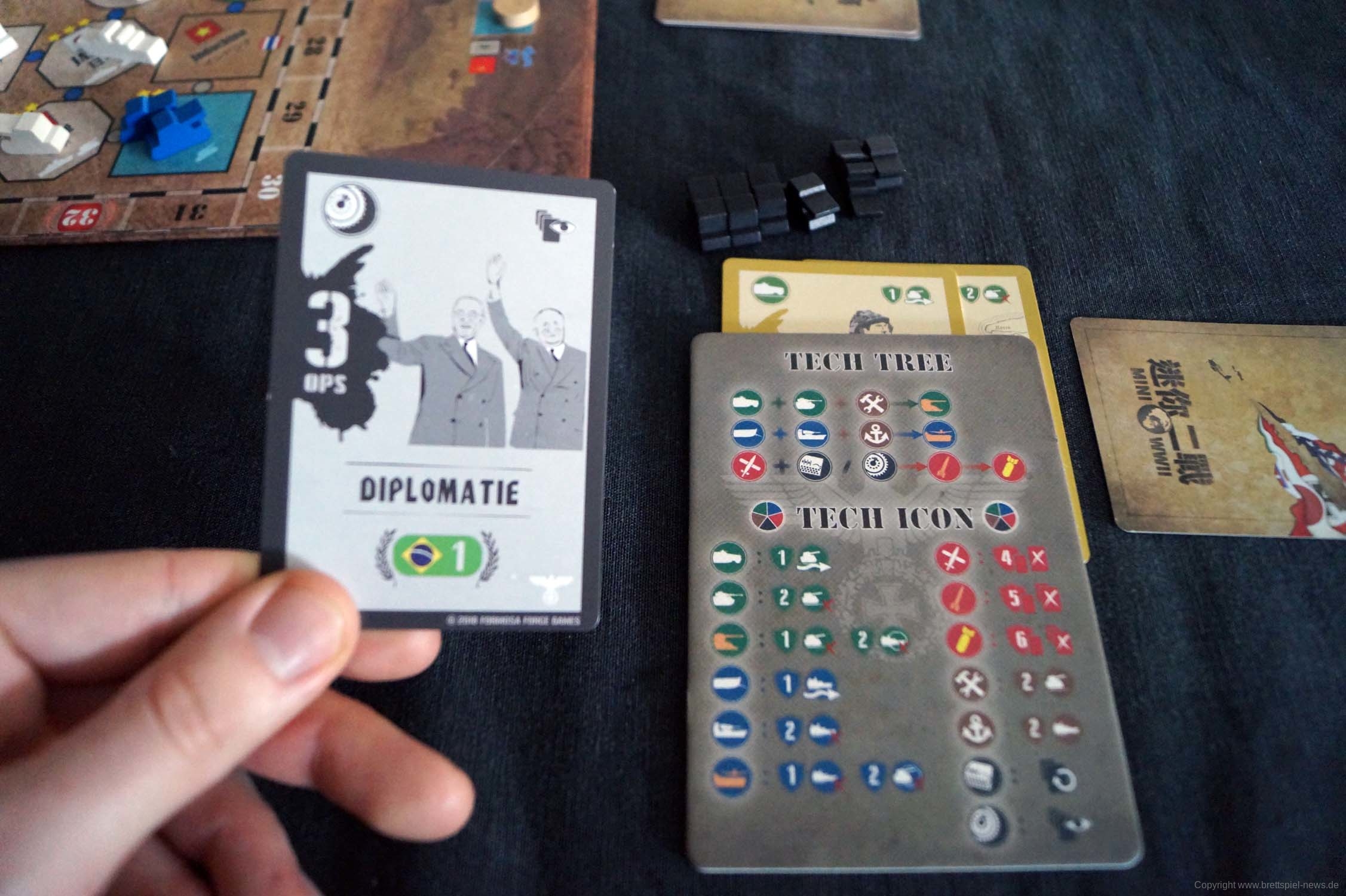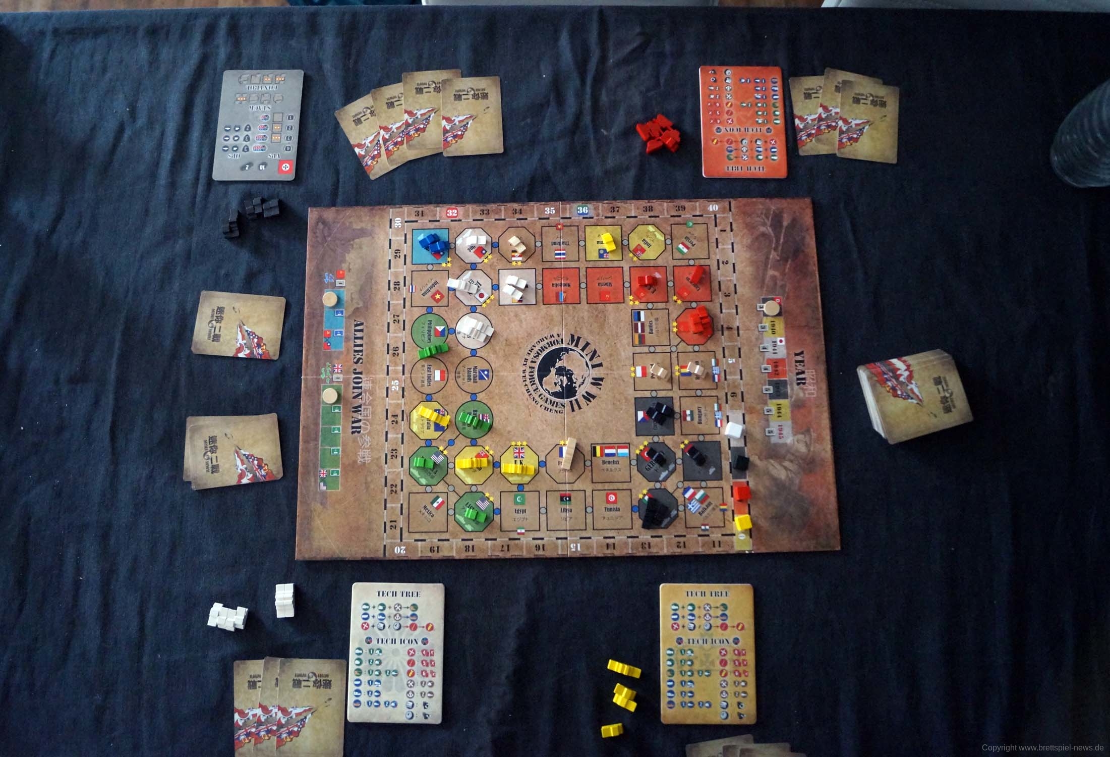 Gut dargestellt ist auch, dass China und die USA nicht gleich zu Beginn im Krieg dabei sind. So müssen die Alliierten erst Zeit aufwenden, um sie dazu zu bewegen oder die Achsenmächte aggressiver vorgehen, was sie auch nur tun sollten, wenn sie die Gebiete direkt kontrollieren können. Der Glücksfaktor ist vorhanden, jedoch nicht zu hoch, da man immer in der Strategiephase 1 Karte (mit der richtigen Forschung 2) austauschen kann, nichtsdestotrotz kam es bei Testspielen natürlich in den entscheidenden Momenten dazu, dass man die falschen Karten zog, aber auch Glück spielt beim Krieg eine Rolle.