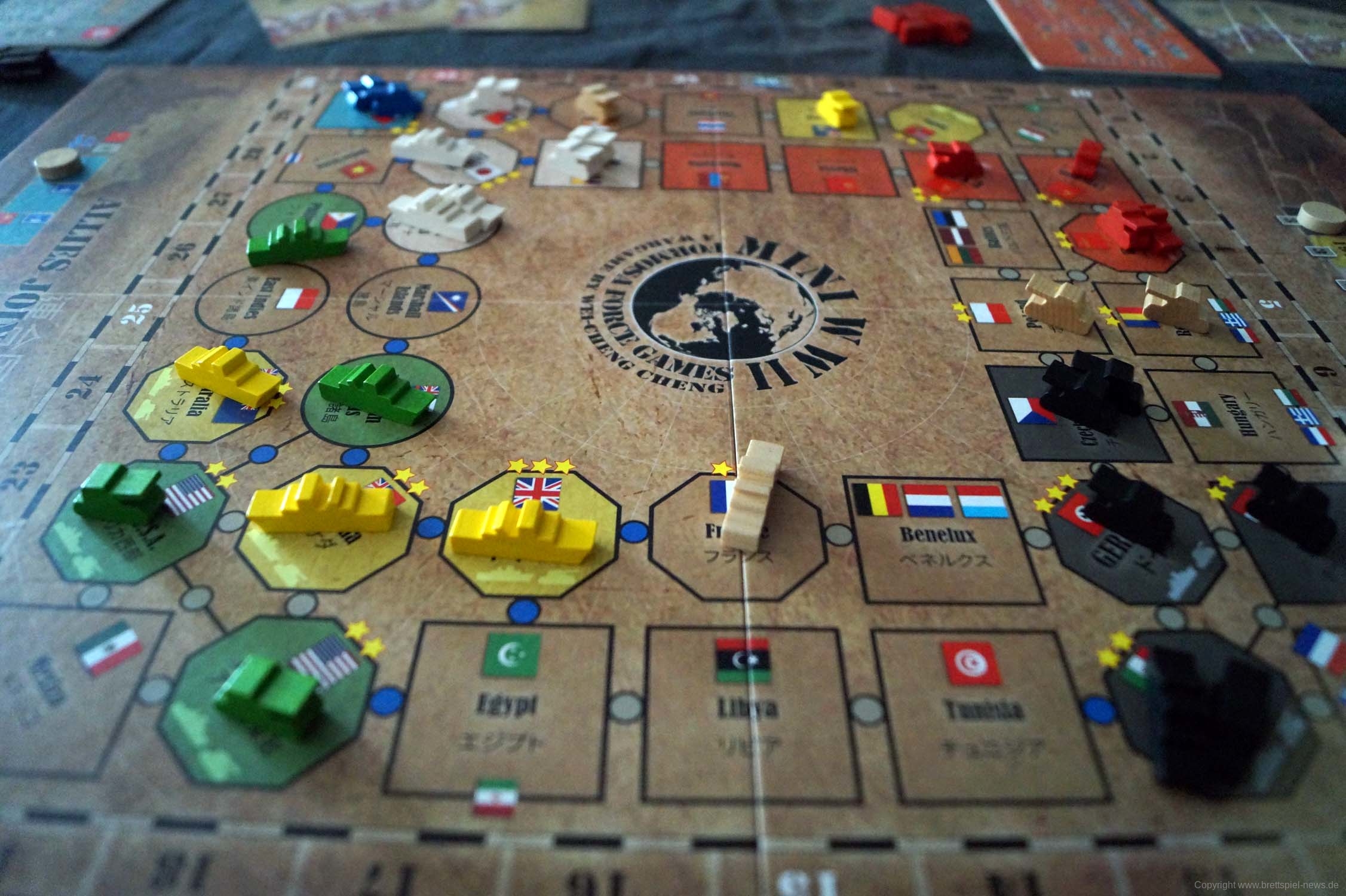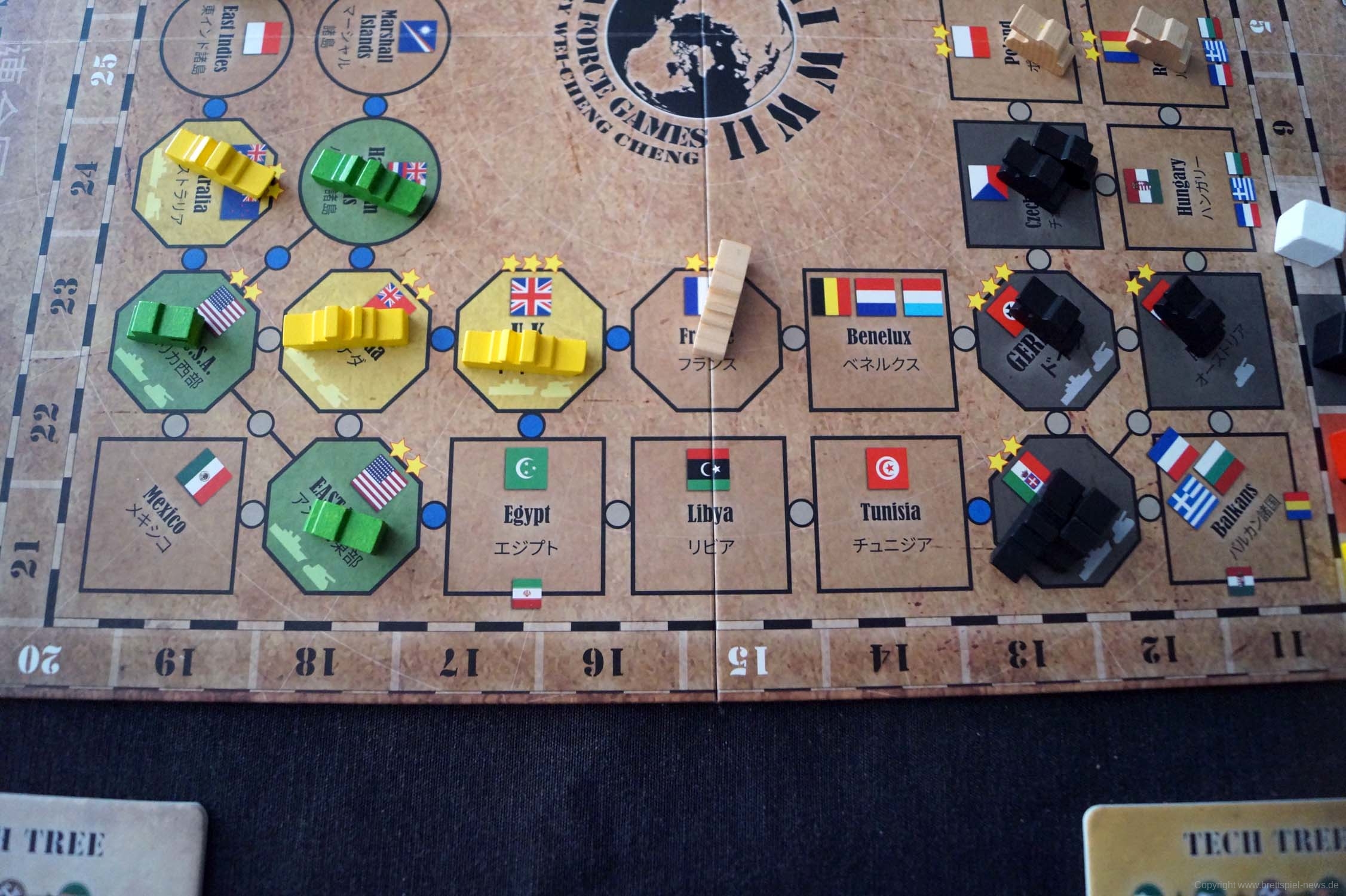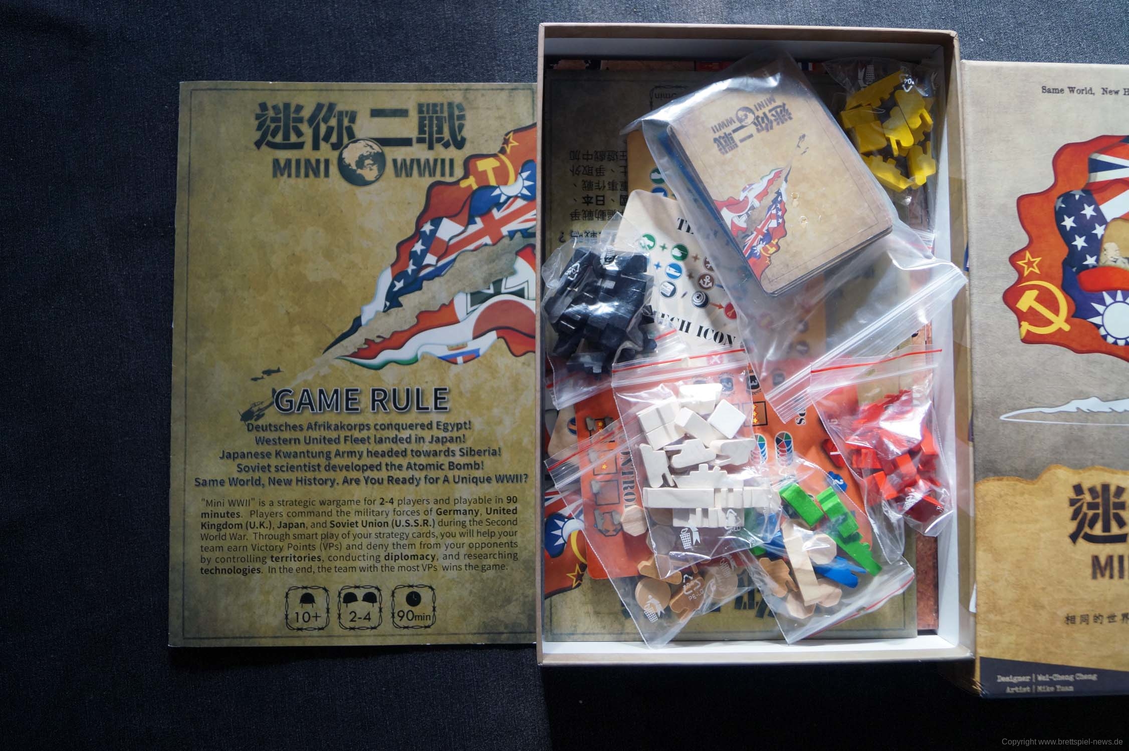 Gut dargestellt ist auch, dass China und die USA nicht gleich zu Beginn im Krieg dabei sind. So müssen die Alliierten erst Zeit aufwenden, um sie dazu zu bewegen oder die Achsenmächte aggressiver vorgehen, was sie auch nur tun sollten, wenn sie die Gebiete direkt kontrollieren können. Der Glücksfaktor ist vorhanden, jedoch nicht zu hoch, da man immer in der Strategiephase 1 Karte (mit der richtigen Forschung 2) austauschen kann, nichtsdestotrotz kam es bei Testspielen natürlich in den entscheidenden Momenten dazu, dass man die falschen Karten zog, aber auch Glück spielt beim Krieg eine Rolle.