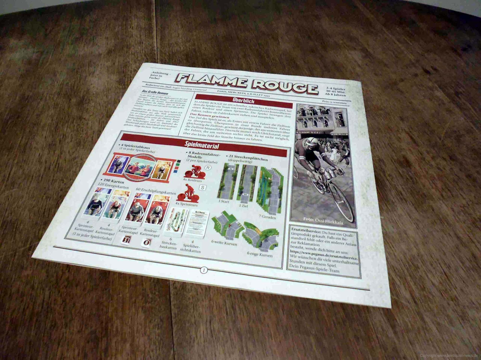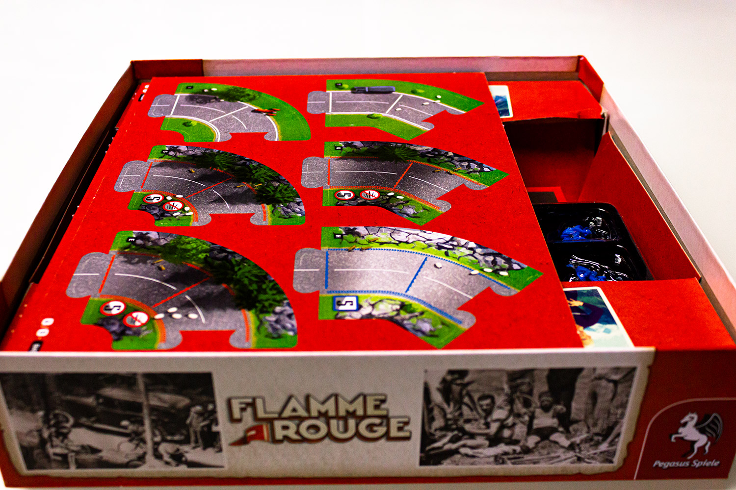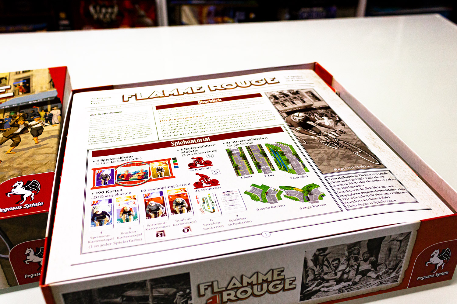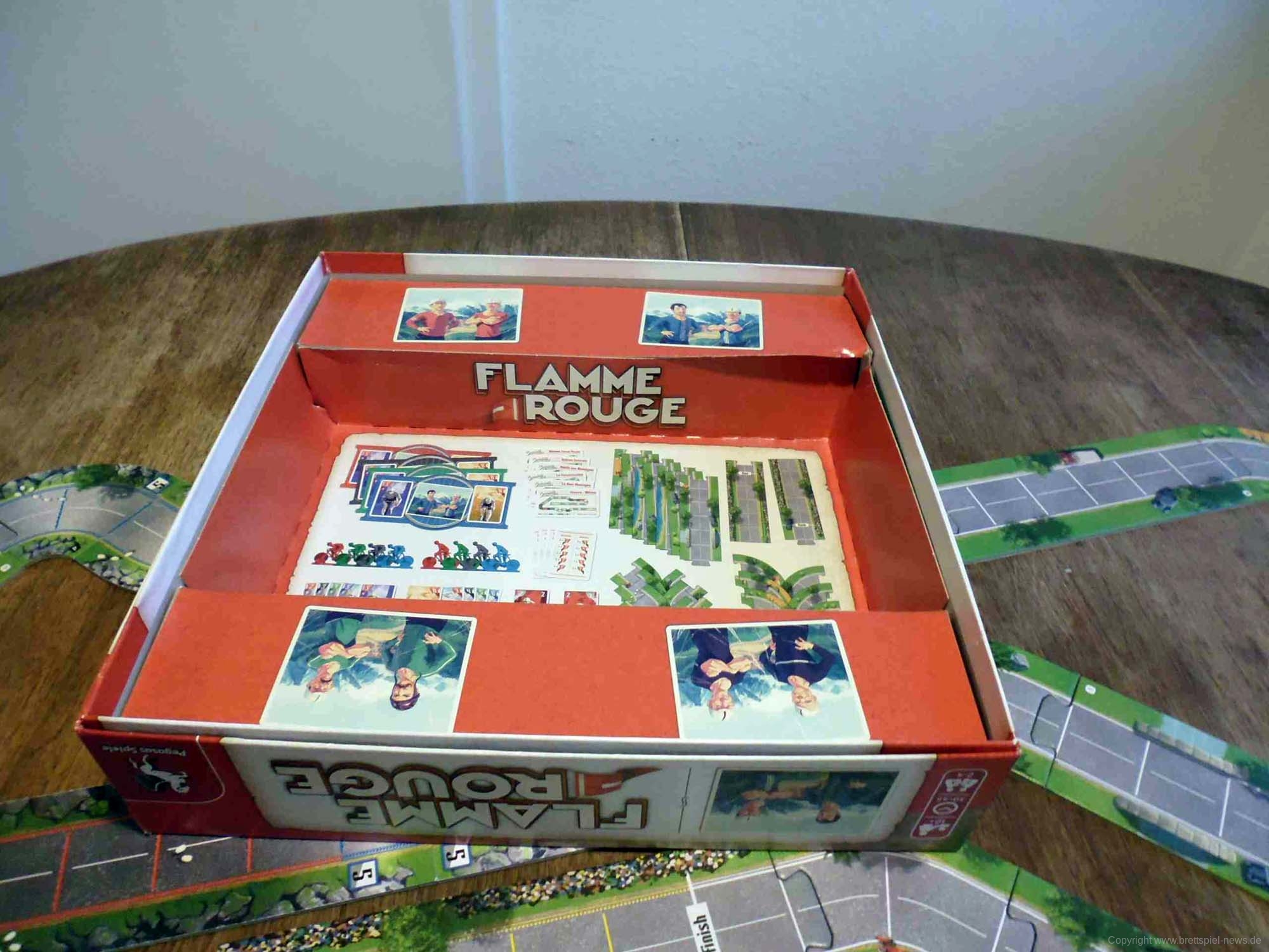 Mit FLAMME ROUGE haben die Autoren ein grundsolides Brettspiel auf den Markt gebracht, dass die Lücke zwischen klassischen Laufspielen und umfangreicheren Rennspielen wie Formula D, Downforce, Bat Cup, Rallyman GT oder Robo Rally schließt. Dabei gelingt es ihnen, ein recht unverbrauchtes Setting gut umzusetzen, da Material und Mechanik Hand in Hand mit dem Thema gehen. Appropos Material: Hier hat mir besonders die Gestaltung der Anleitung gefallen, welche einem alten Zeitungsbericht über ein Radrennen nachempfunden ist. Störend empfinde ich hingegen das Einräumen des Spielmaterials in die Schachtel, da das Inlay etwas zu klein geraten ist.