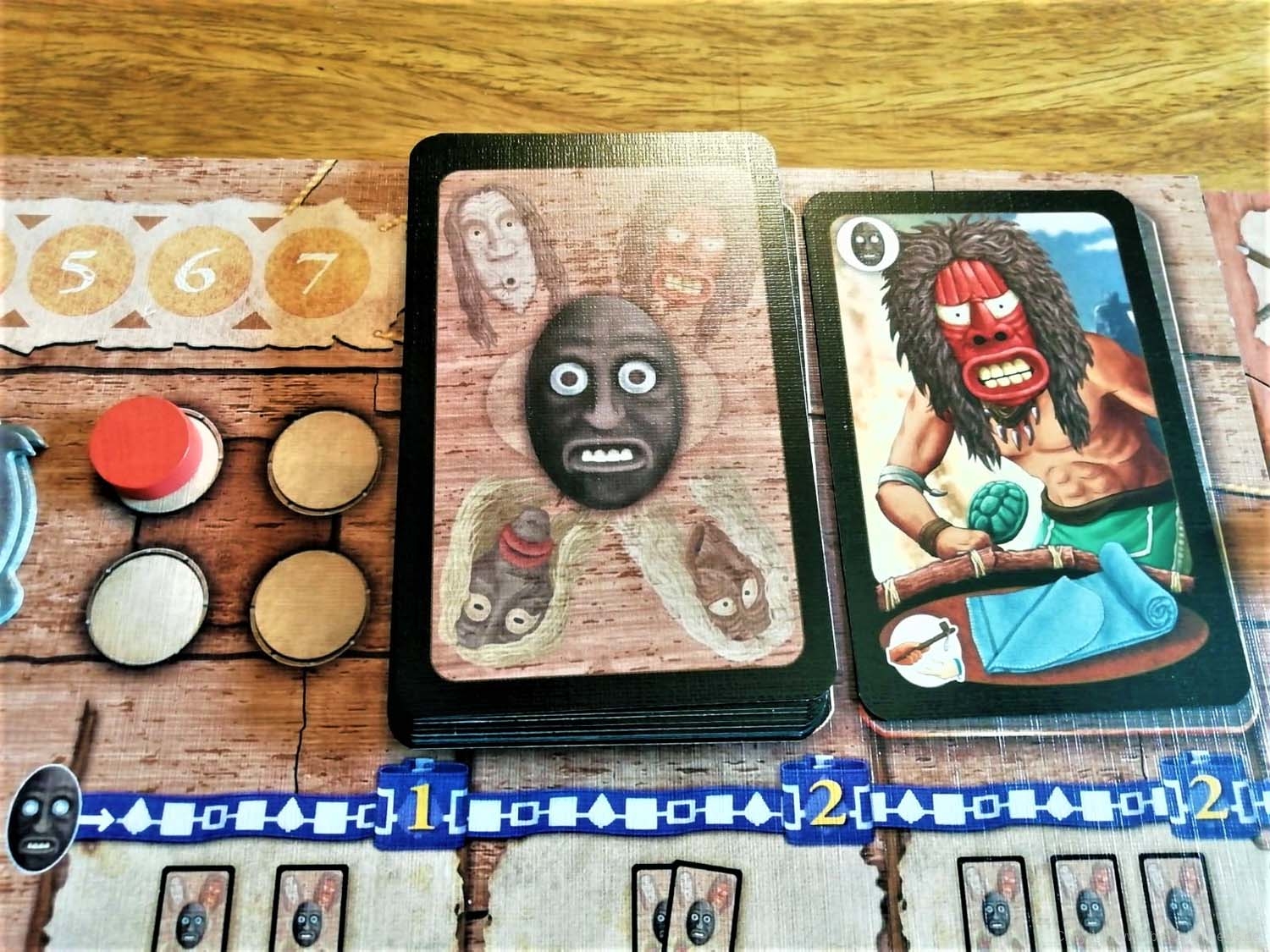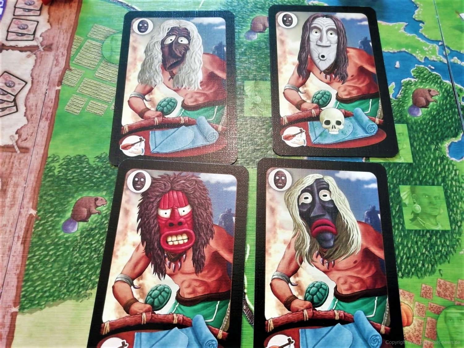 - Maskenzeremonie: Die Maskenzeremonie besteht aus zwei Teilen. Zuerst darf eine Maskenkarte gezogen werden. Der Spieler entscheidet dann, ob er diese behält oder ob er die oberste Karte des offenen Ablagestapels auf die Hand nimmt. Im Anschluss darf der Spieler eine Kombination an Masken ausspielen, die auf der Maskenleiste Punkte bringt. Wie viel Punkte die jeweilige Kombination einbringt, kann von der sogenannten Maskenzeremonie-Tafel abgelesen werden.