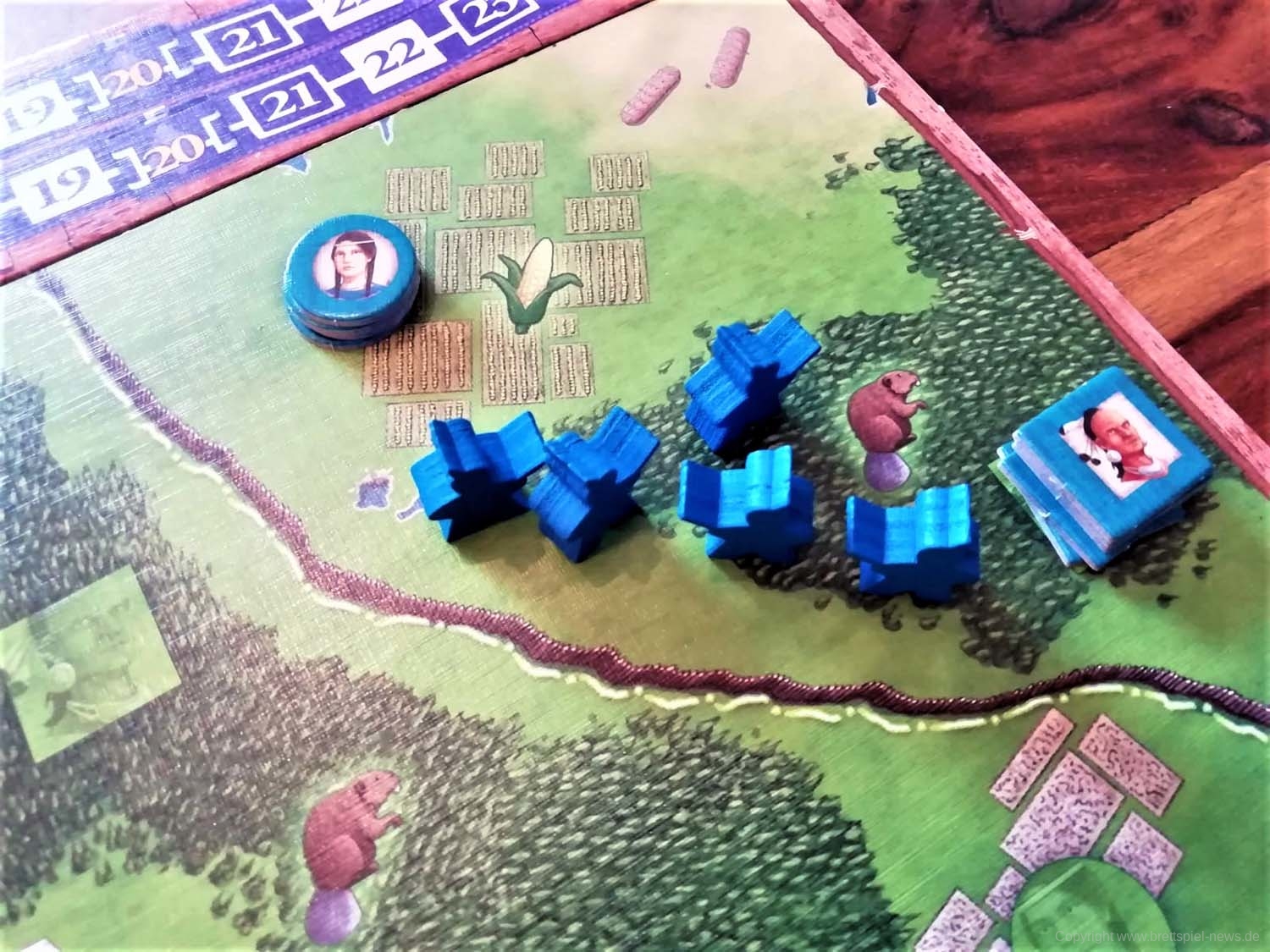 - Jagd: Jeder Produktionsbereich, in dem der Spieler einen Jäger platziert hat, produziert ein Biberplättchen.