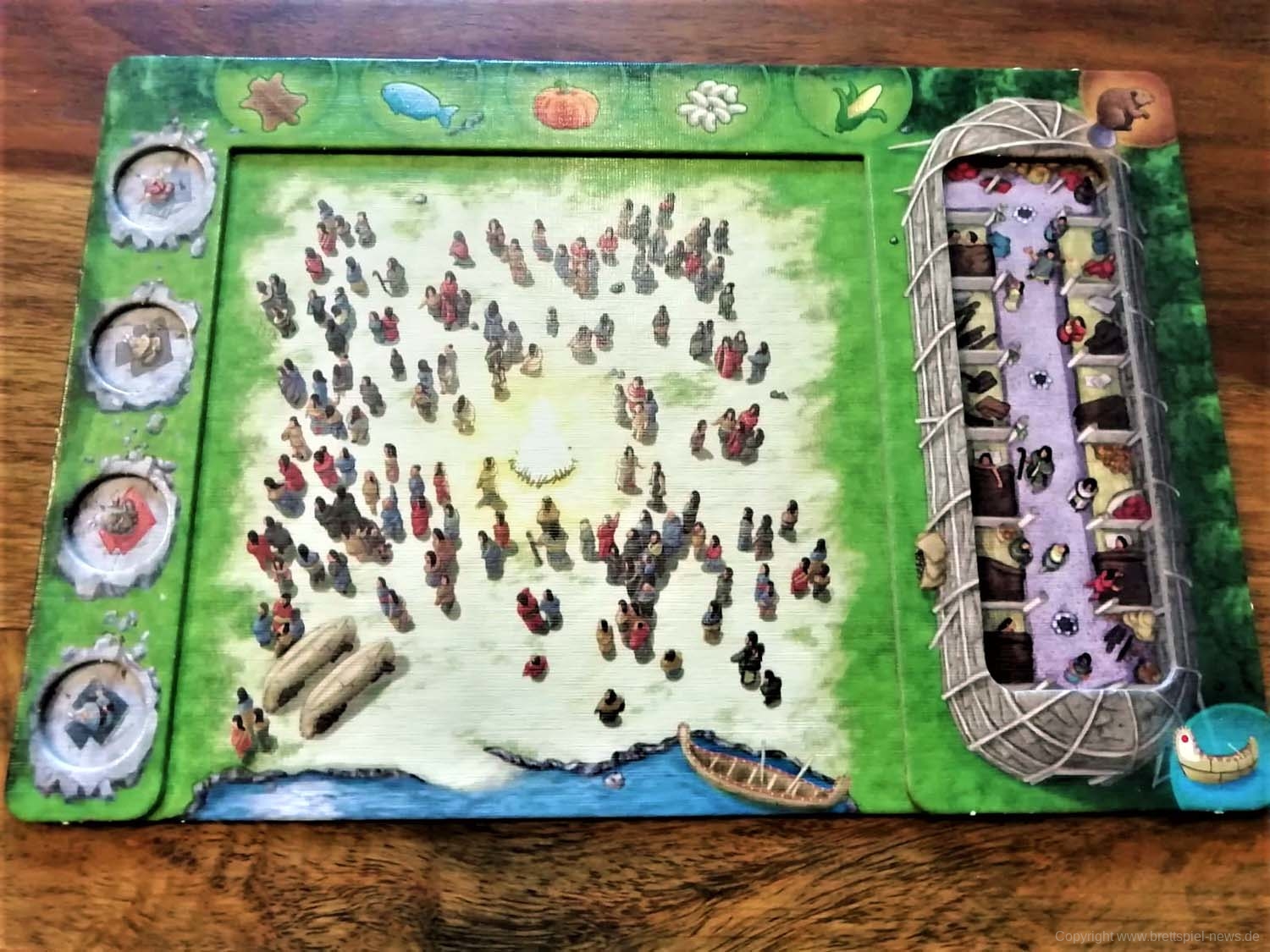 Die Box von WENDAKE ist gut gefüllt. Die eingelassenen Spieler-Tableus sind hochwertig. Krieger, Kanus, Ressourcen, Aktionssteine und Stammesscheiben sind alle aus Holz gefertigt und machen etwas her. Dazu kommt noch sehr viel Material aus dicker Pappe. Der zusammengesetzte Spielplan ist sehr schön gestaltet, könnte meiner Meinung nach aber etwas größer sein.