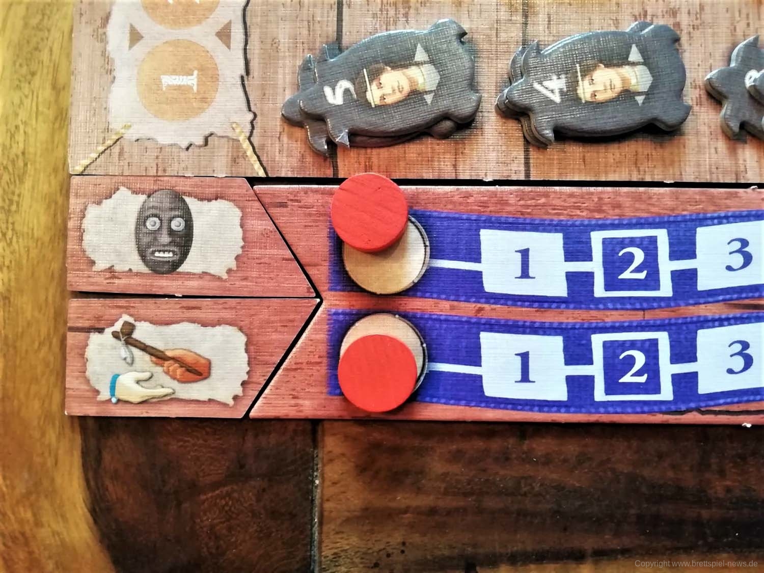 - Ritual: Mit dieser Aktion, die sich auf der Rückseite jedes Aktionsplättchen befindet, können verletzte oder erkrankte Ureinwohner wieder zurück in das Spiel gebracht und Punkte auf der Ritualleiste erzielt werden.