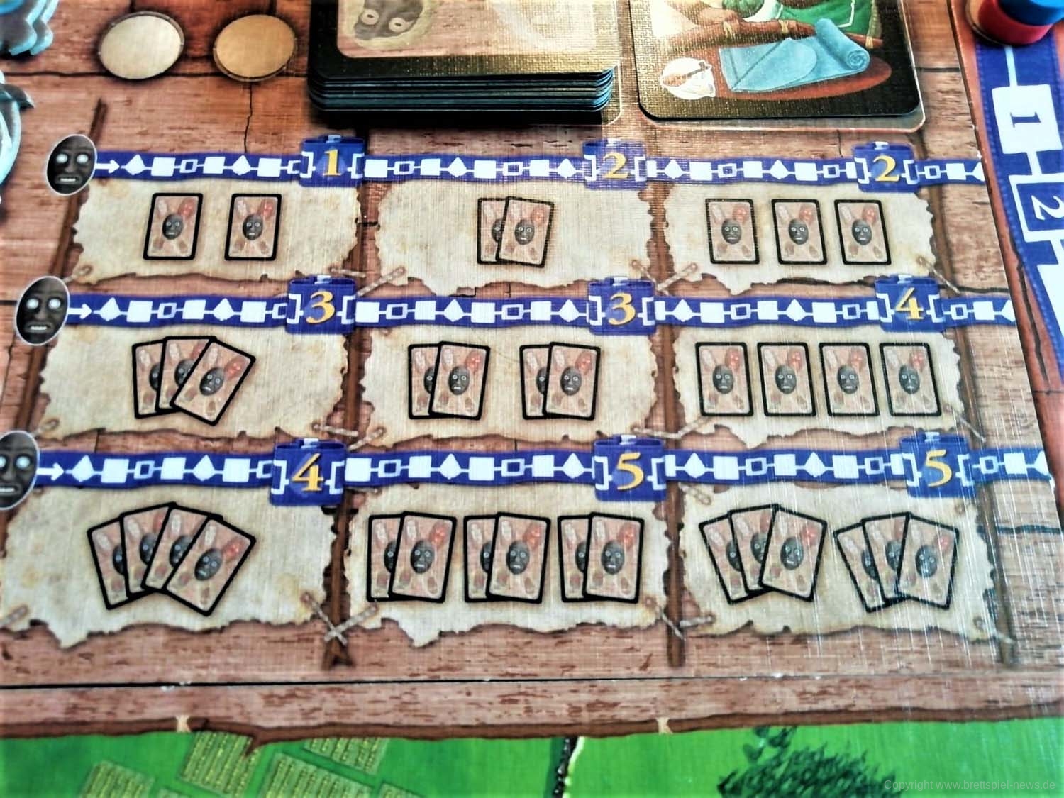 Auch die Aktionstafeln im 3x3-Format sind innovativ. Zuerst ist alles noch sehr übersichtlich, sobald aber einige fortgeschrittene Aktionsplättchen ergattert wurden, eröffnen sich einem viele strategische Möglichkeiten und es muss versucht werden, eine möglichst effiziente Folge von Aktionen durchzuführen.