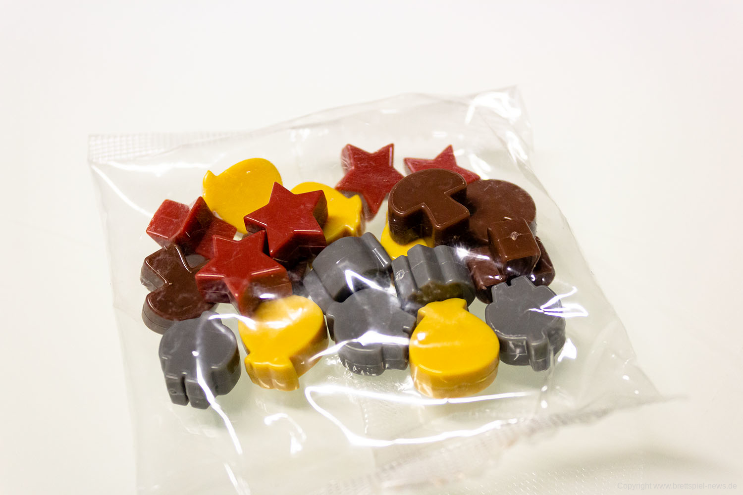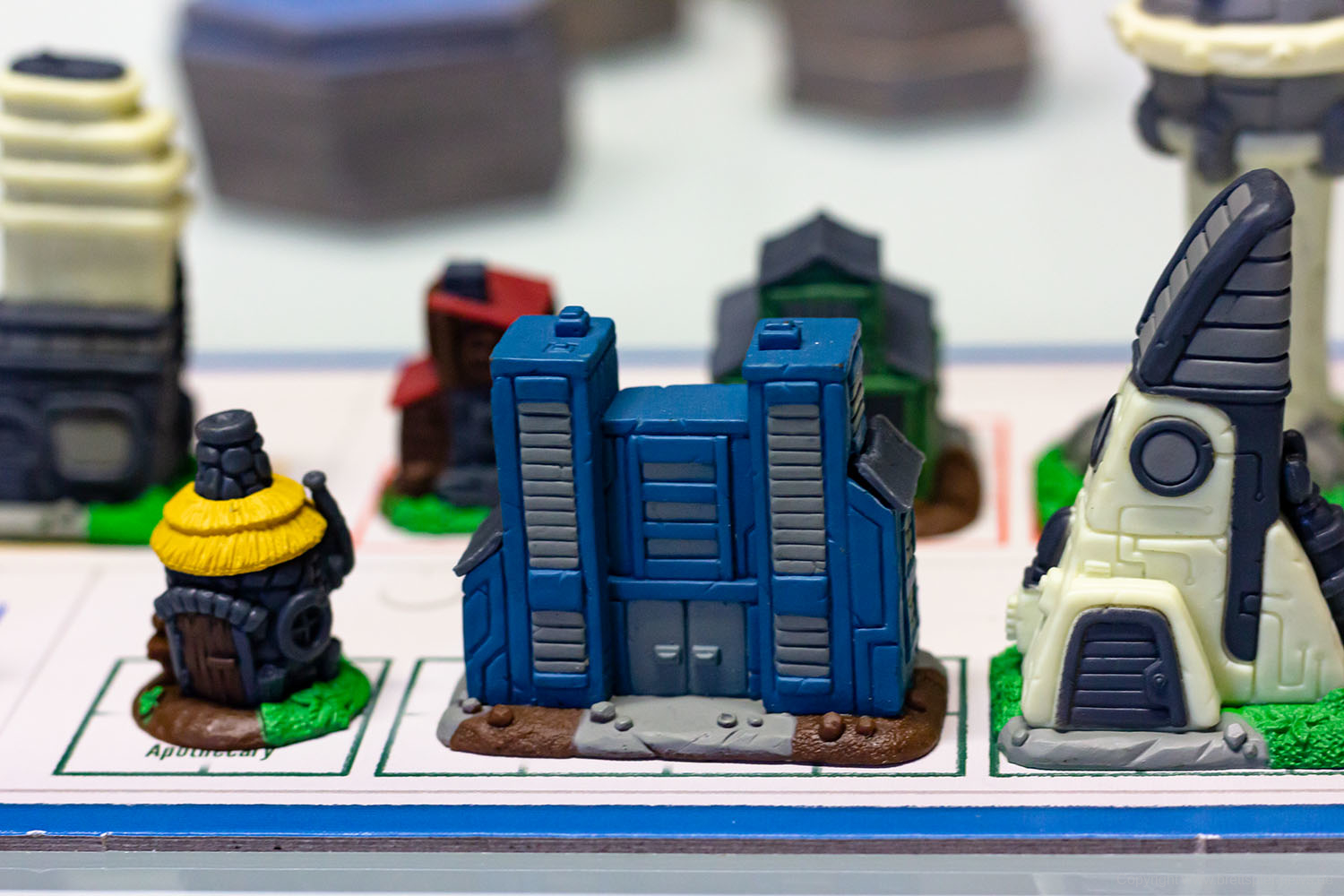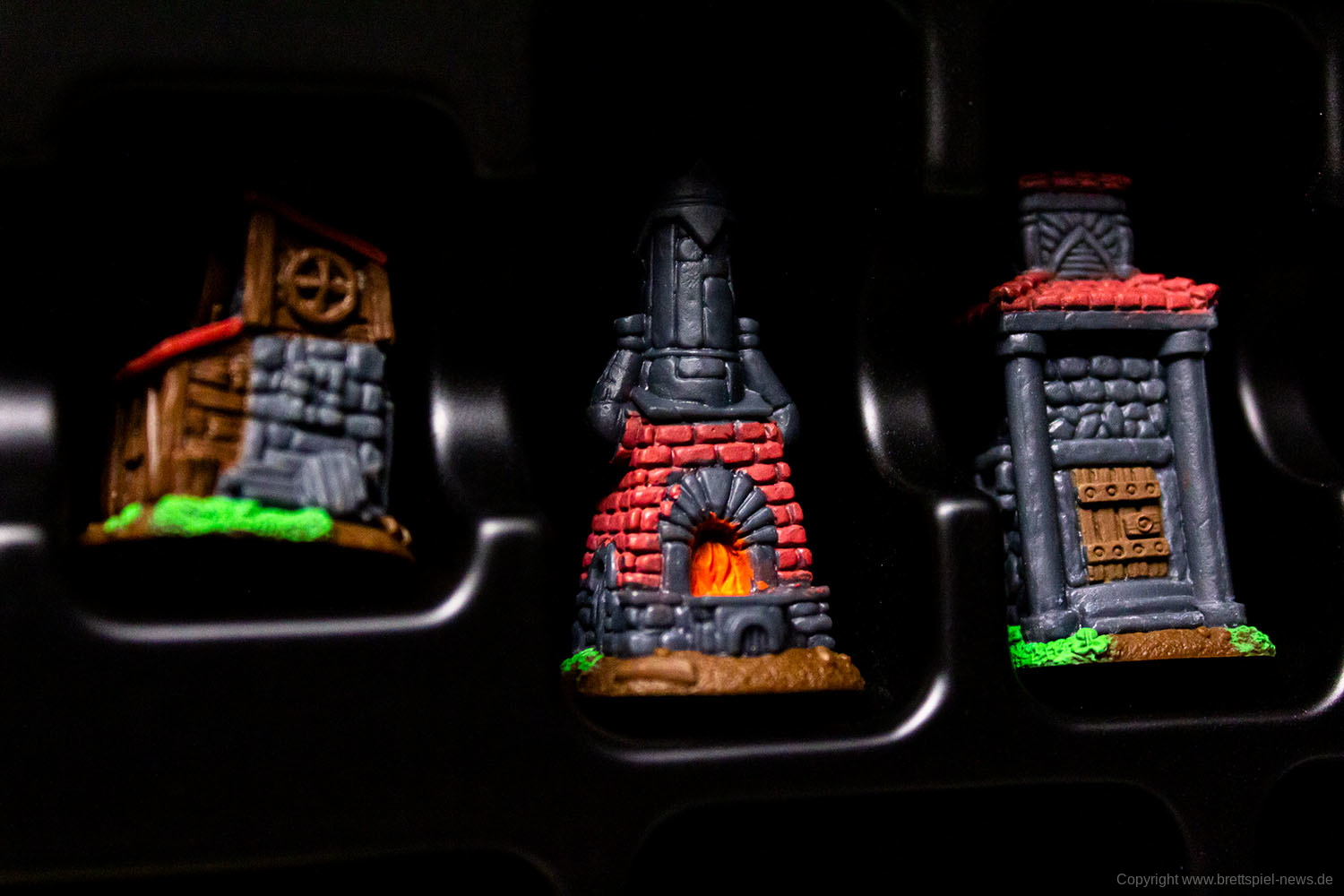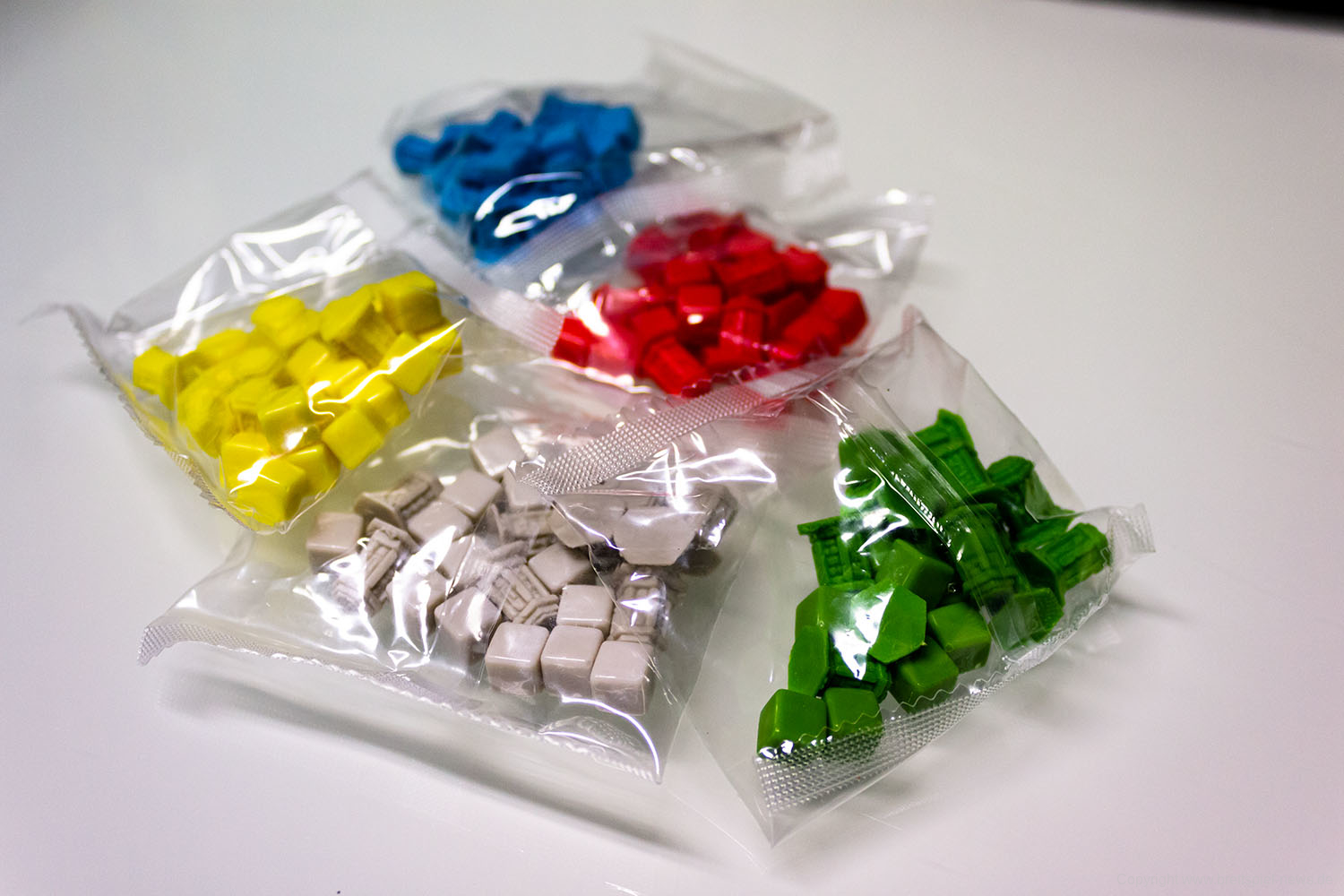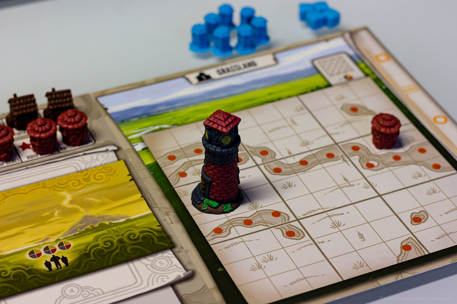 Kommen wir zum nächsten negativen Punkt – die Wahrzeichenminiaturen. Generell sehen die in ihren bunten Farben gut aus. Das ist dann aber auch schon alles, was positives darüber gesagt werden kann. Die Miniaturen dürften ein Grund dafür sein, dass das Spiel seinen Preis hat, im Spiel selbst bringen sie allerdings nicht viel. Es fängt schon damit an, dass die Gebäude keinen Charakter besitzen. Anstatt z.B. Wahrzeichen für die blaue Leiste in Blau zu halten und Gebäude für die grüne Leiste in Grün, ist alles irgendwie gemischt. Am Ende ist es aber auch egal, da es eh nur darauf ankommt, wie viele Felder von einem Wahrzeichen verdeckt werden. Doch hier gibt es auch schon wieder Probleme, weil das nicht immer gut übersichtlich ist. Miniaturen wie das Gummiwerk lassen teils nur erahnen, welche Felder besetzt sind. Es ist sicherlich kein Zufall, dass es ausdruckbare Auflagen als Ersatz für die Gebäude gibt, die hier für einen besseren Überblick sorgen.