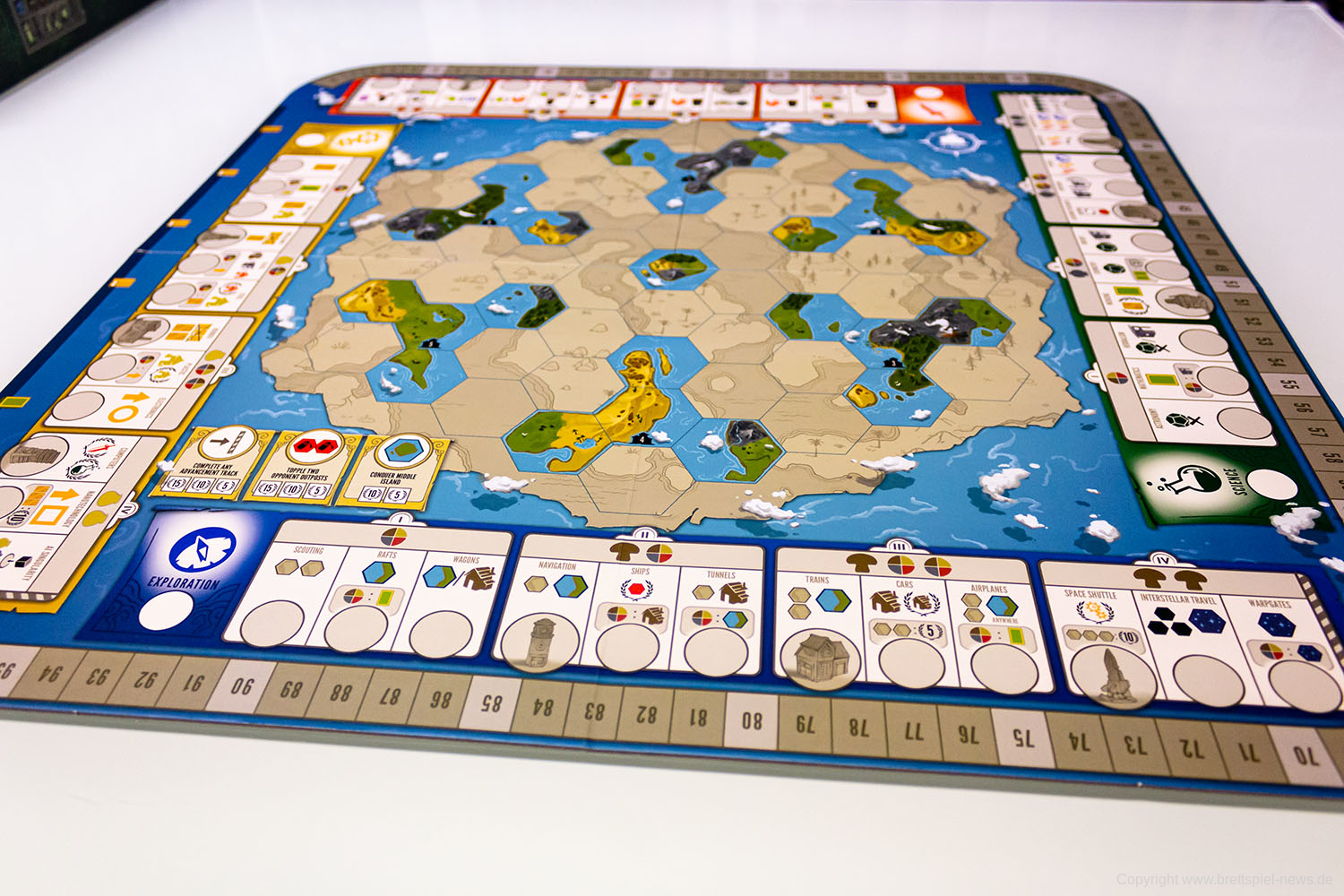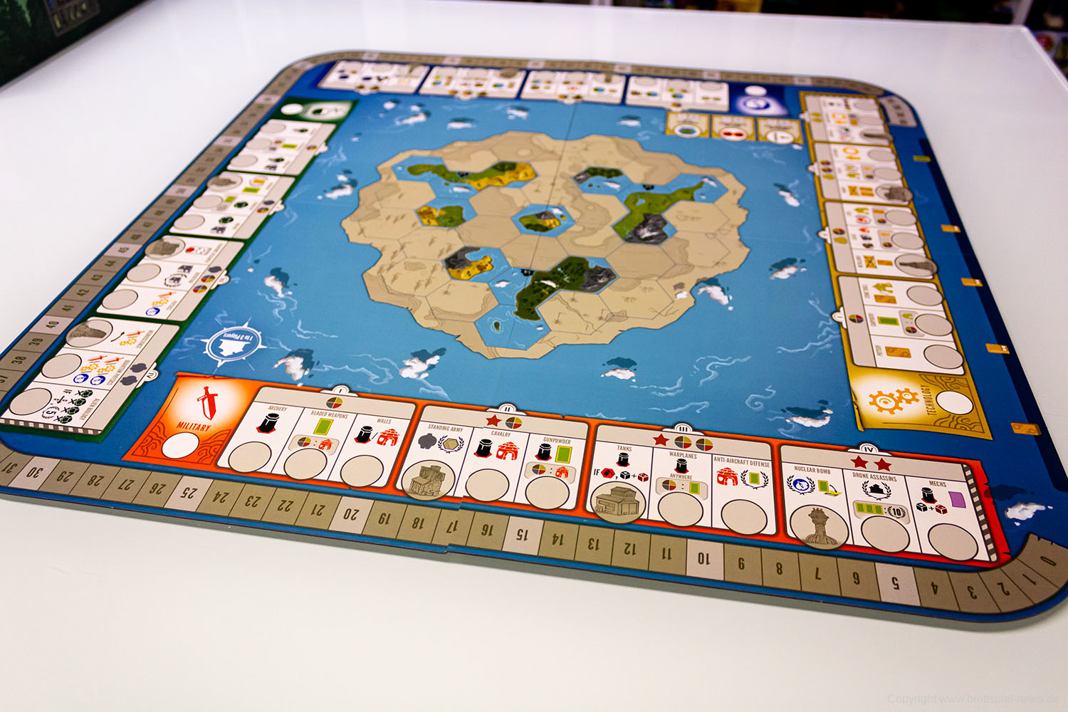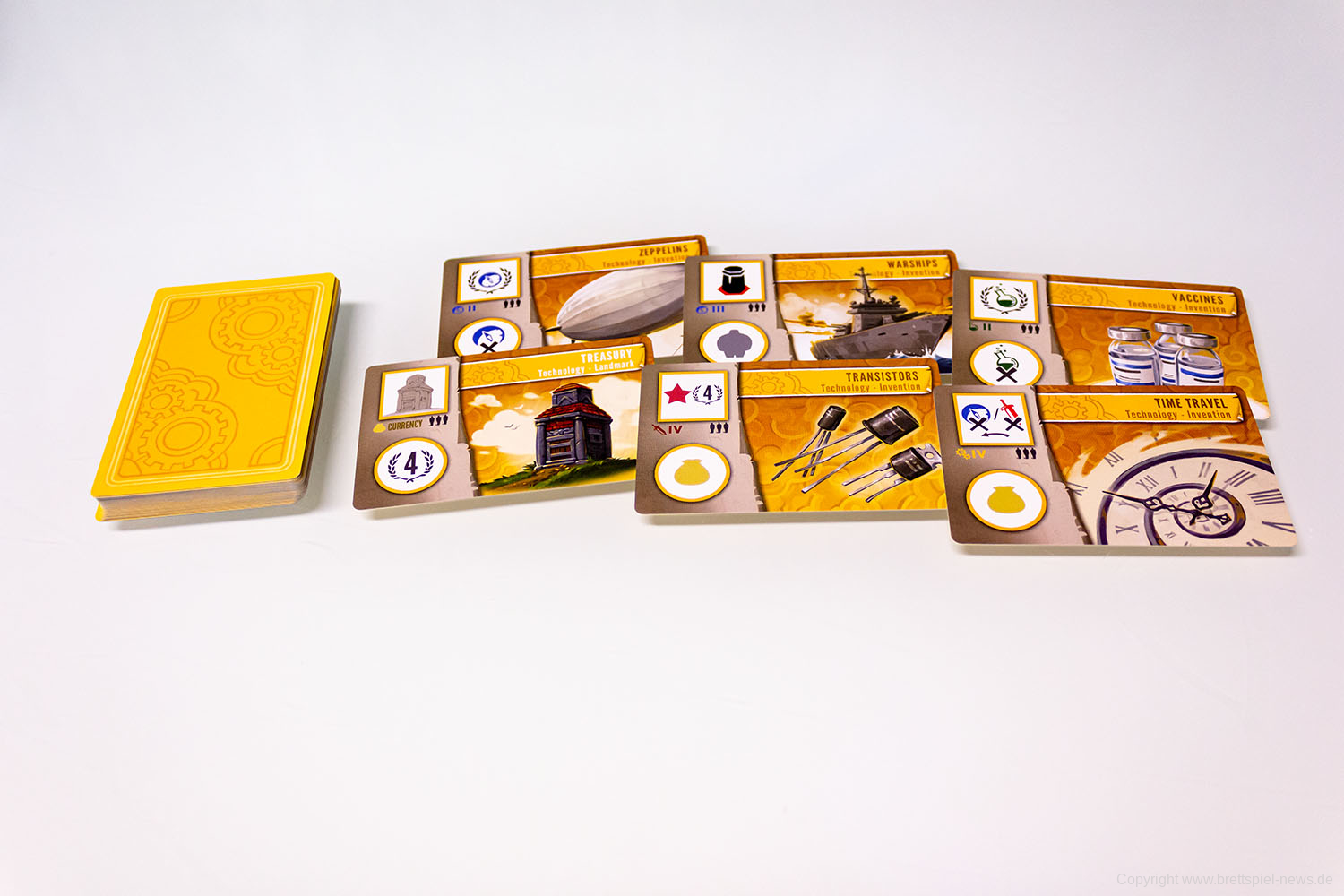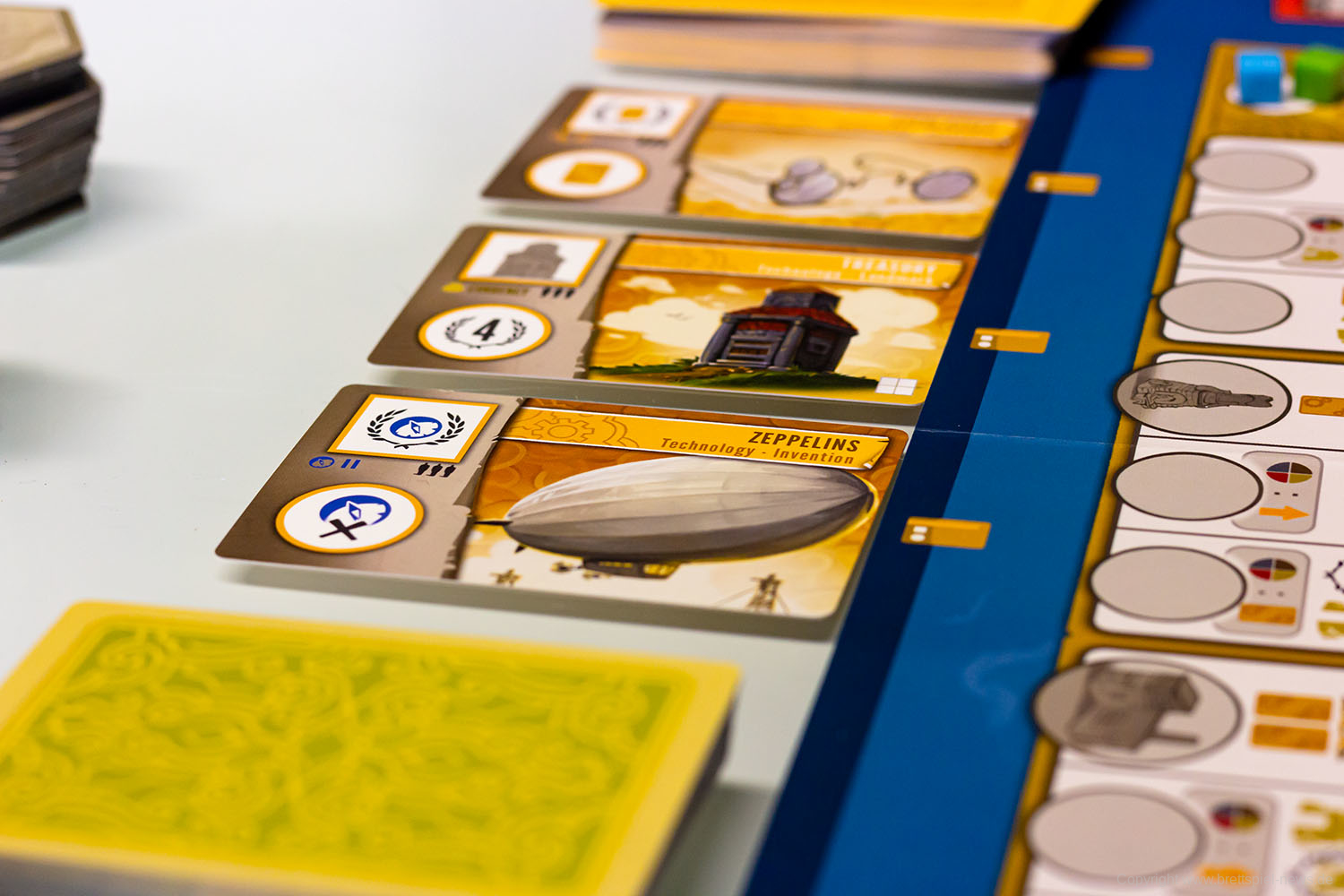 Dass es thematisch nicht passt, kann ich so akzeptieren, da die Mechanik an sich wunderbar funktioniert. Es ist für mich immer wieder eine Freude, neue Strategien zu erproben. Ob ich beispielsweise eine Kombination der gelben mit der grüner Leiste ausprobiere oder doch lieber eine der blauen mit der roten. Setze ich erst einmal eine Leiste bis zur 12. Errungenschaft hoch oder doch besser zwei Leisten im Gleichschritt? Soll ich mich auf die Techkarten konzentrieren oder erobere ich lieber die Welt? Die Handlungsmöglichkeiten an sich sind gut überschaubar, ohne dabei jedoch an Reiz zu verlieren. Dadurch sind schnelle Runden möglich, in denen sich die Downtime in Grenzen hält. Selbst bei Mitspielern, die sich schnell in einer Analyse-Paralyse befinden, dürfte sich das Grübeln am Ende in Maßen halten. Und am Ende gibt es immer wieder die Momente, in denen versucht wird, die fehlende Ressource noch irgendwie zu beschaffen, indem kreativ einzelne Funktionen genutzt werden.