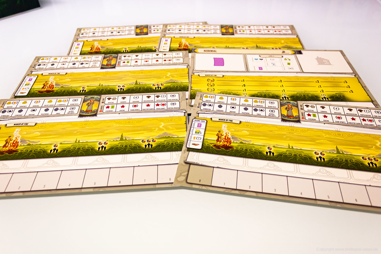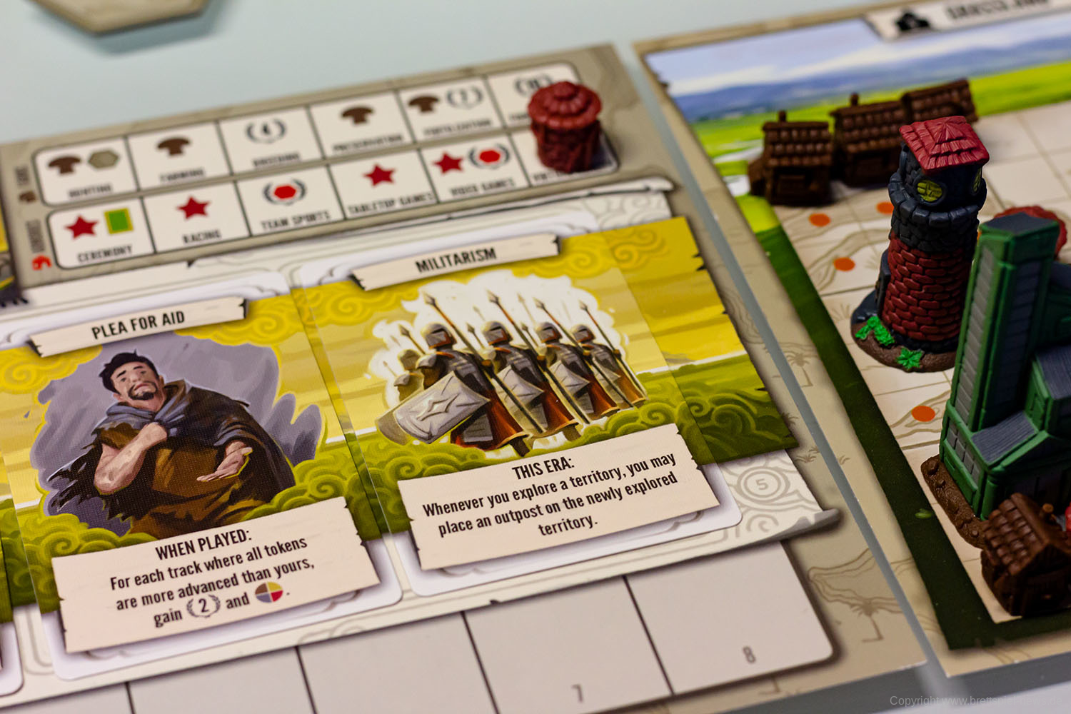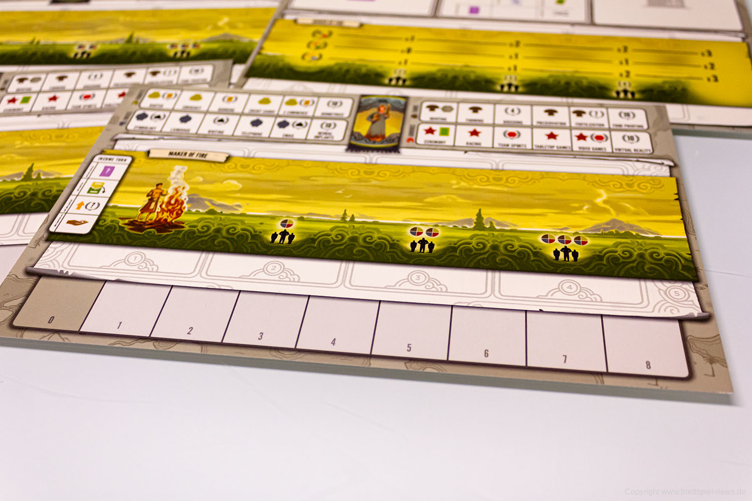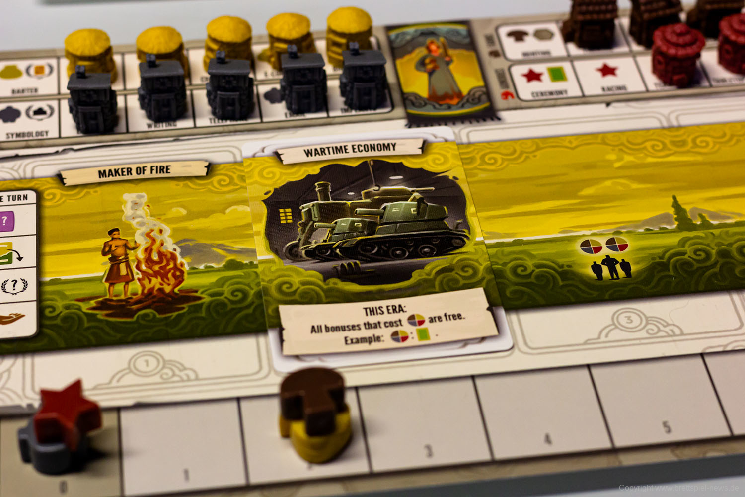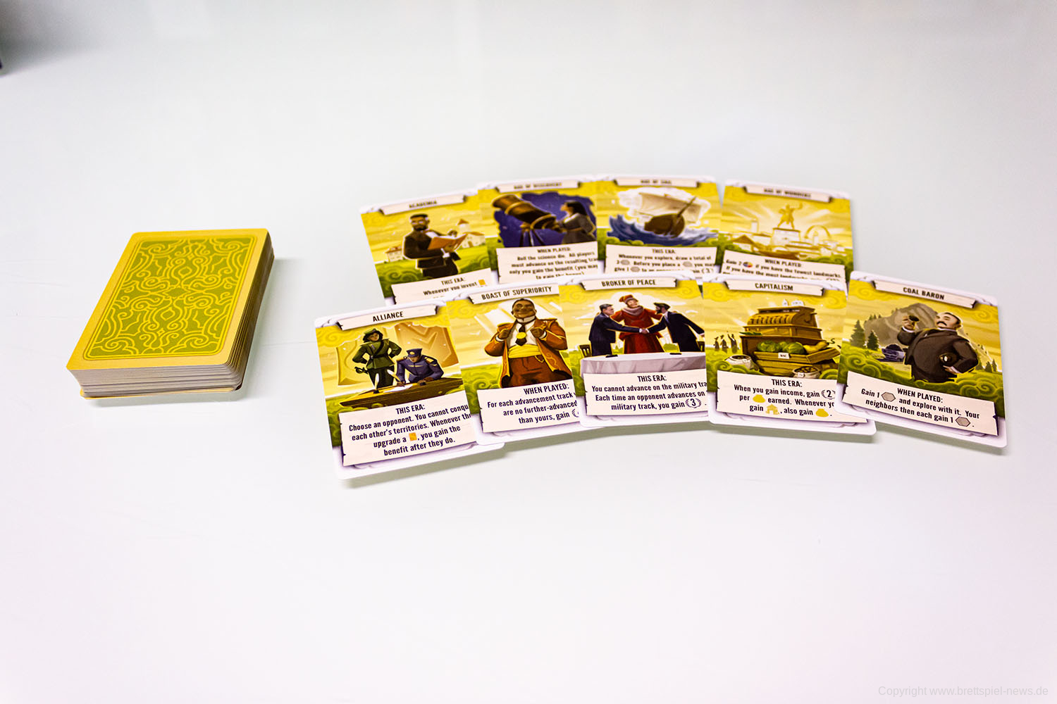 Dass es thematisch nicht passt, kann ich so akzeptieren, da die Mechanik an sich wunderbar funktioniert. Es ist für mich immer wieder eine Freude, neue Strategien zu erproben. Ob ich beispielsweise eine Kombination der gelben mit der grüner Leiste ausprobiere oder doch lieber eine der blauen mit der roten. Setze ich erst einmal eine Leiste bis zur 12. Errungenschaft hoch oder doch besser zwei Leisten im Gleichschritt? Soll ich mich auf die Techkarten konzentrieren oder erobere ich lieber die Welt? Die Handlungsmöglichkeiten an sich sind gut überschaubar, ohne dabei jedoch an Reiz zu verlieren. Dadurch sind schnelle Runden möglich, in denen sich die Downtime in Grenzen hält. Selbst bei Mitspielern, die sich schnell in einer Analyse-Paralyse befinden, dürfte sich das Grübeln am Ende in Maßen halten. Und am Ende gibt es immer wieder die Momente, in denen versucht wird, die fehlende Ressource noch irgendwie zu beschaffen, indem kreativ einzelne Funktionen genutzt werden.