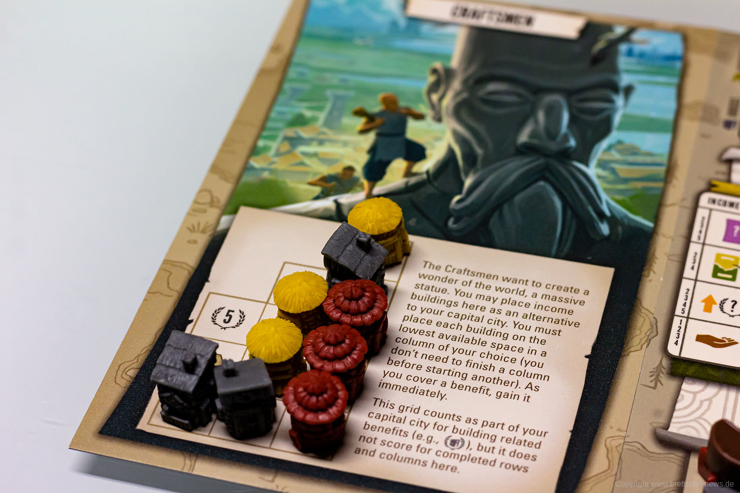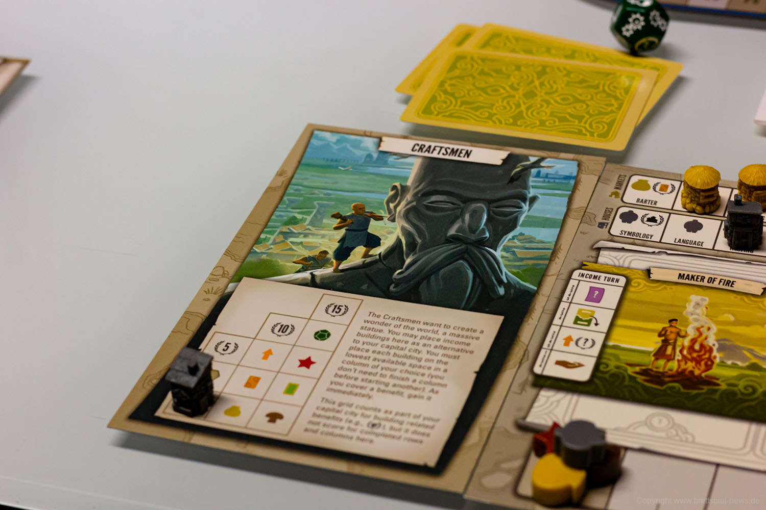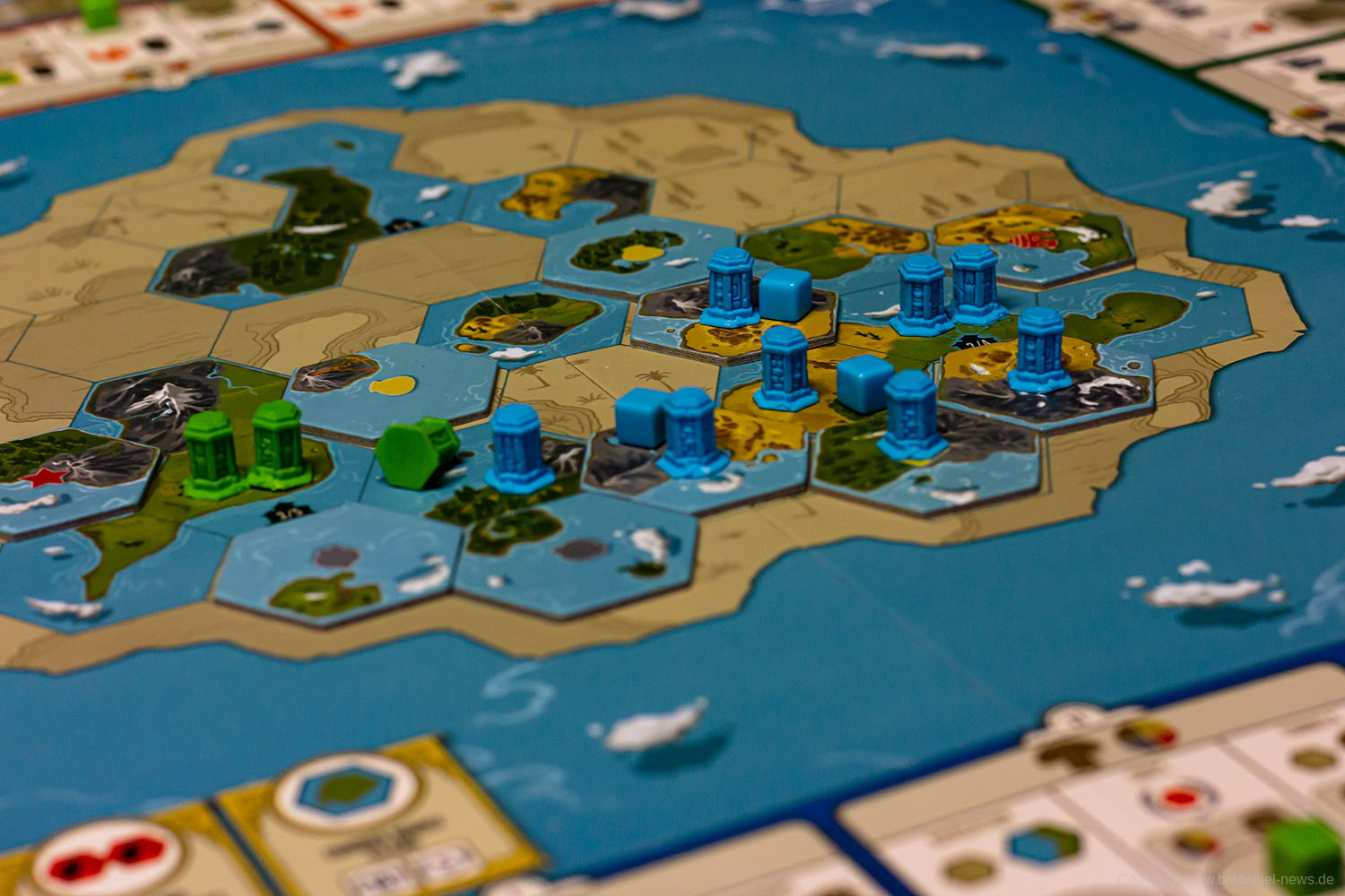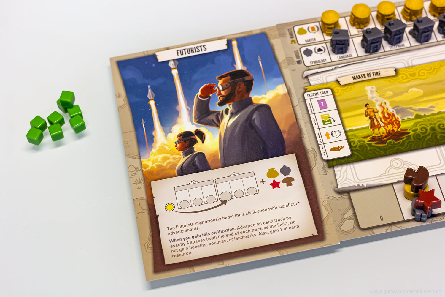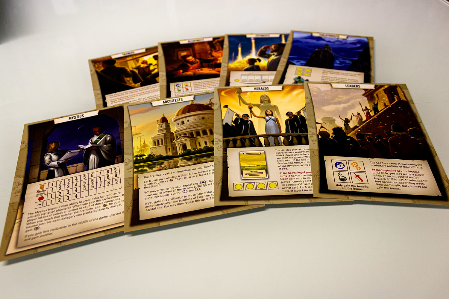 Und zum Schluss dann noch der größte Punkt – das Balancing der Zivilisationen. Die Asymmetrie bei den Zivilisationen ist sicherlich eine lobenswerte Idee, die für Abwechslung und verschiedene Strategien sorgt. Nur sind manche Zivilisationen, wie z.B. die Futuristen oder Handwerker, dermaßen stark sind im Vergleich zu den eher durchwachsenen Zivilisationen, wie z.B. den Mystikern oder Architekten, dass der Spielespaß ganz schnell verloren gehen kann. Es gibt zwar mittlerweile kleinere Anpassungen bei einzelnen Zivilisationen, die das Problem aber nicht wirklich beheben und nur ein bisschen mit Boni oder Mali bei Punkten und Ressourcen arbeiten.