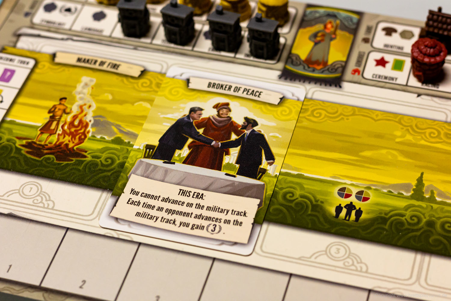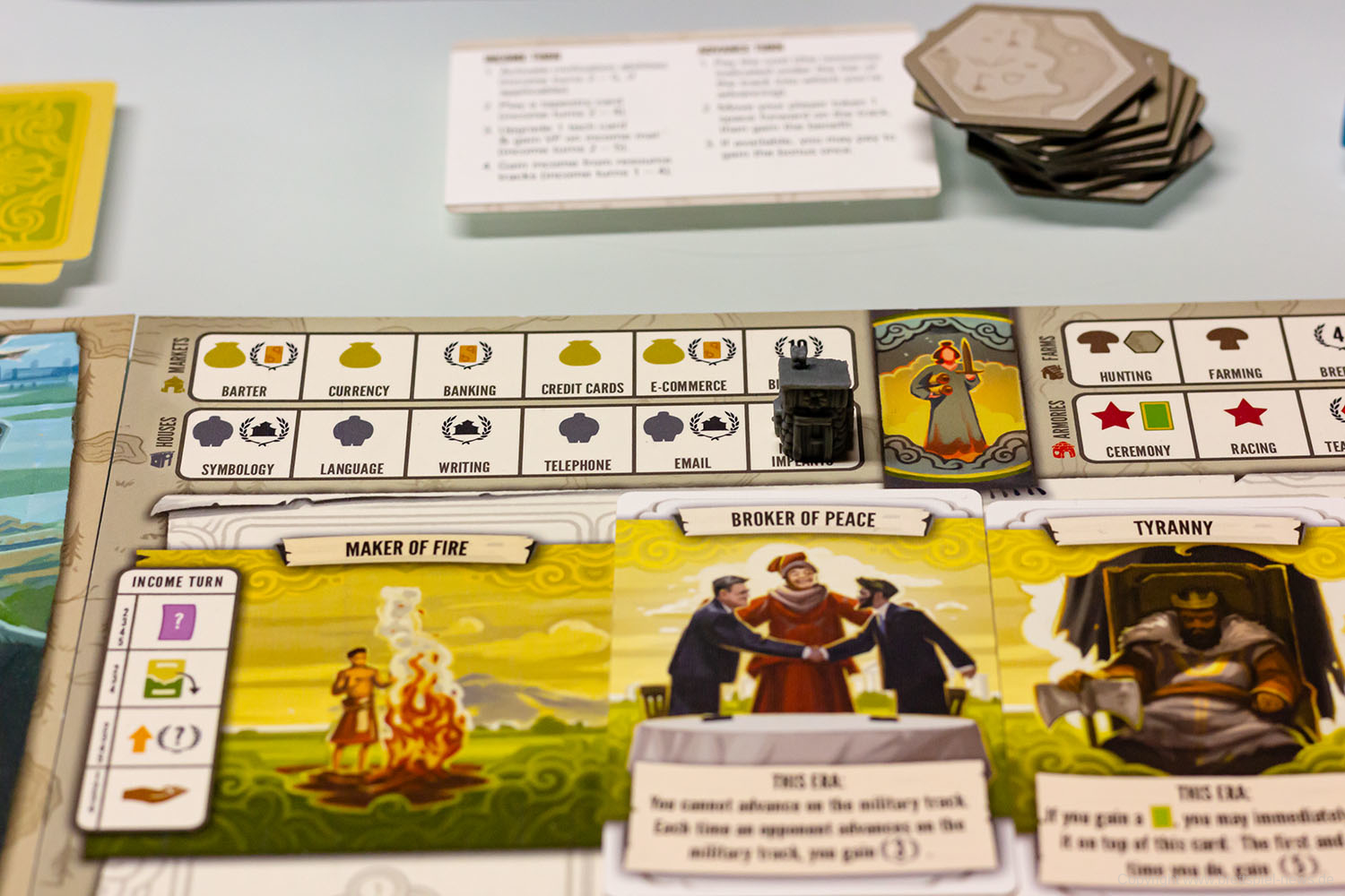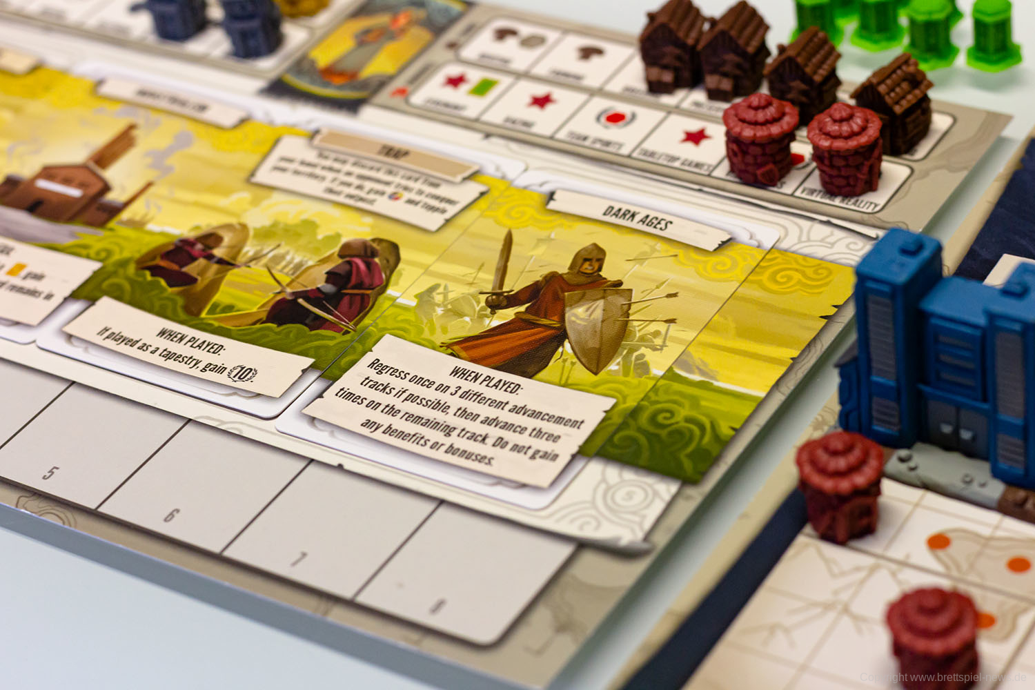 Beginnen wir mit den Kritikpunkten: Thematisch geht mir TAPESTRY fast komplett am Allerwertesten vorbei. Wenn wir spielen, gibt es keine Entdeckungs-Fortschrittsleiste, es gibt nur die blaue Leiste. Bei uns werden nicht Arbeiter genutzt, um auf der Wissenschafts-Fortschrittsleiste voranzukommen. Wir benutzen einen grauen Meeple für das Vorrücken auf der grünen Leiste. Welche Erfindungen auf den gelben Techkarten stehen, ist uns egal. Was wir sehen, ist nur der mögliche Bonus. Warum sollte es uns auch weiter kümmern? Wir müssen theoretisch noch nicht einmal Sprache und Schrift entwickelt haben, können dafür aber schon Bankwesen und Kreditkarten nutzen.
