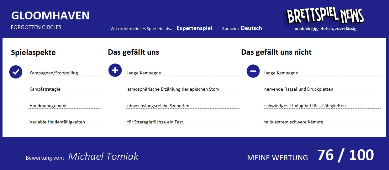 Wer sich weiterhin regelmäßig darauf freut, in die epische GLOOMHAVEN-Welt eintauchen zu können, und vor großen, strategischen Herausforderungen nicht zurückschreckt, der wird sicherlich seine Freude an der Erweiterung finden. Für all jene bedeutet FORGOTTEN CIRCLES endlich frischen Nachschub und die Möglichkeit, noch tiefer in die Geschichte eintauchen und sich noch größeren Herausforderungen stellen zu können. Wer immer noch nicht genug von GLOOMHAVEN bekomme kann, wird sicherlich blind zugreifen können, da er von allem, was er mag, noch mehr bekommt.