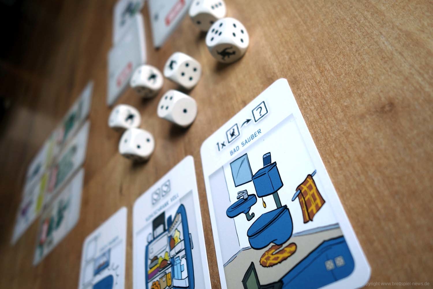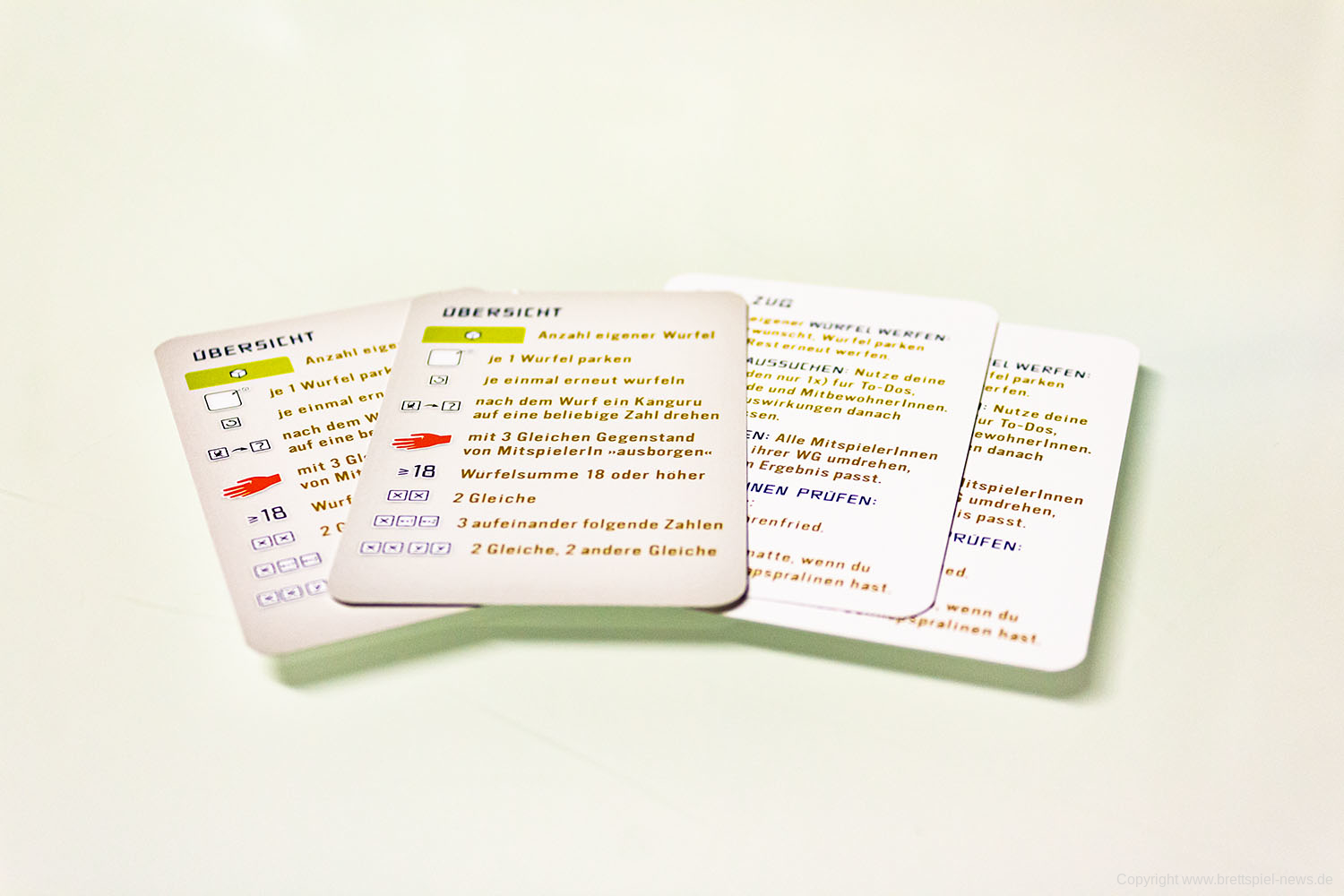 Im echten Leben ist eine WG gewöhnlich auf Funktionalität ausgerichtet. Die WÜRFEL-WG ist dem wahren Leben nachempfunden und ebenso auf das Notwendige reduziert. Das Spiel enthält 79 Spielkarten, sieben Würfel, eine Anleitung und bietet mit diesem überschaubaren Umfang doch alles, was wir benötigen.