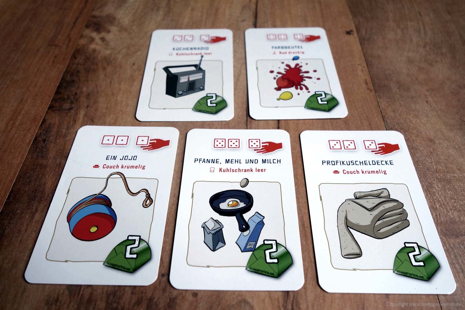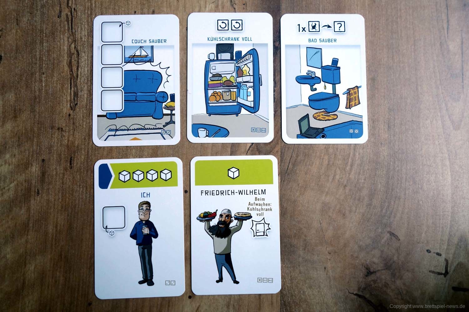 Zu Spielbeginn ist jeder Charakter wach und die restlichen Karten schmutzig bzw. leer. Bei einem, den Möglichkeiten der WG entsprechenden Würfelergebnis, kann dieses nun im Detail für folgende Aktionen eingesetzt werden, wobei die erforderlichen Würfel auf den Karten aufgedruckt sind: