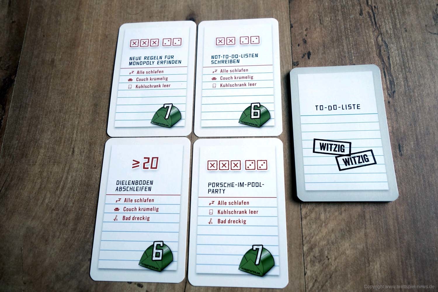 Eine To Do-Karte nehmen, die die angegebenen Siegpunkte beschert, aber auch Nachteile, wie zum Beispiel, dass alle schlafen, oder der Kühlschrank leer ist