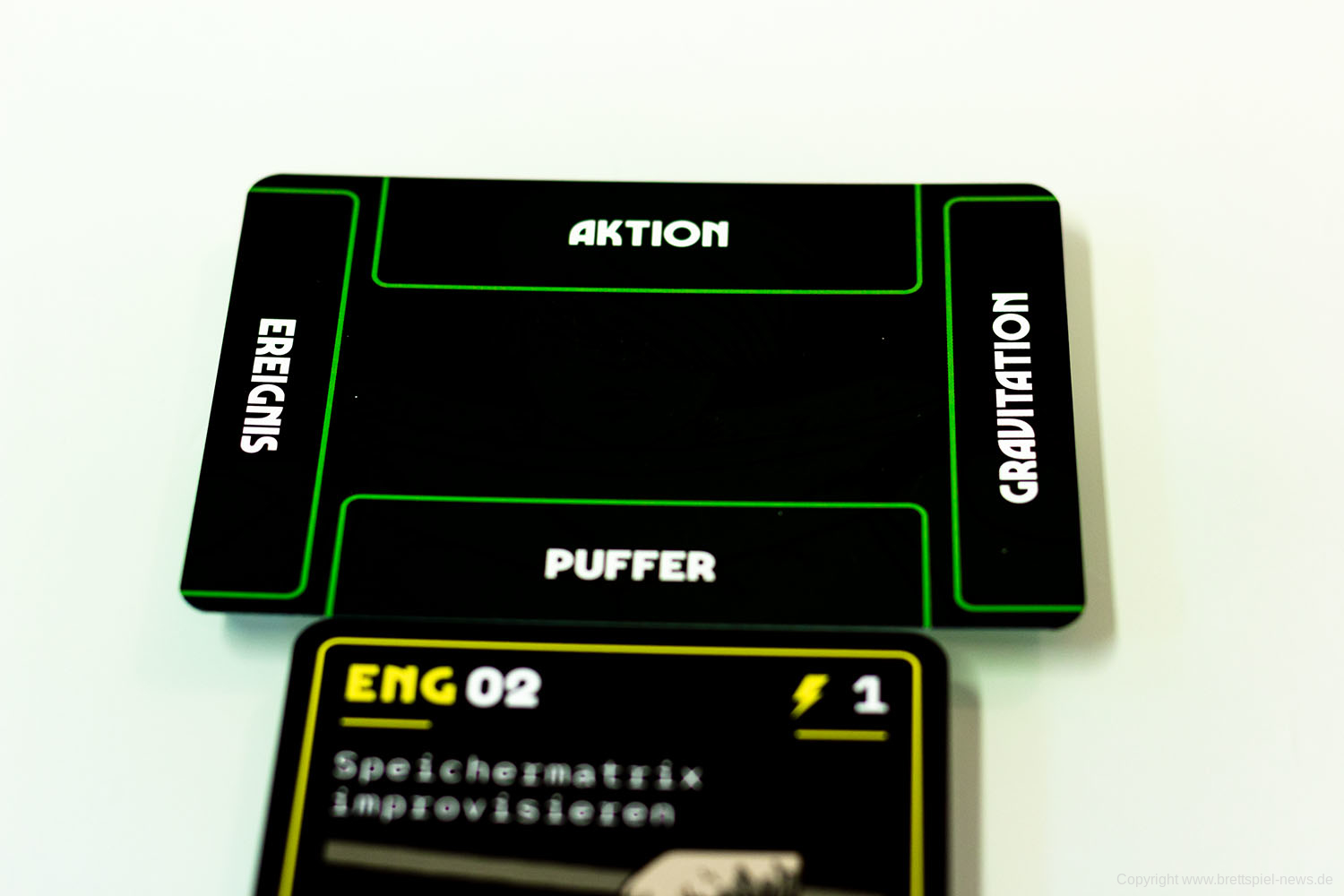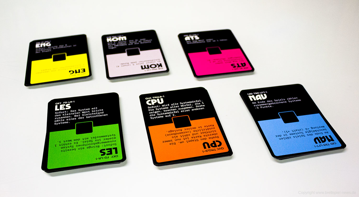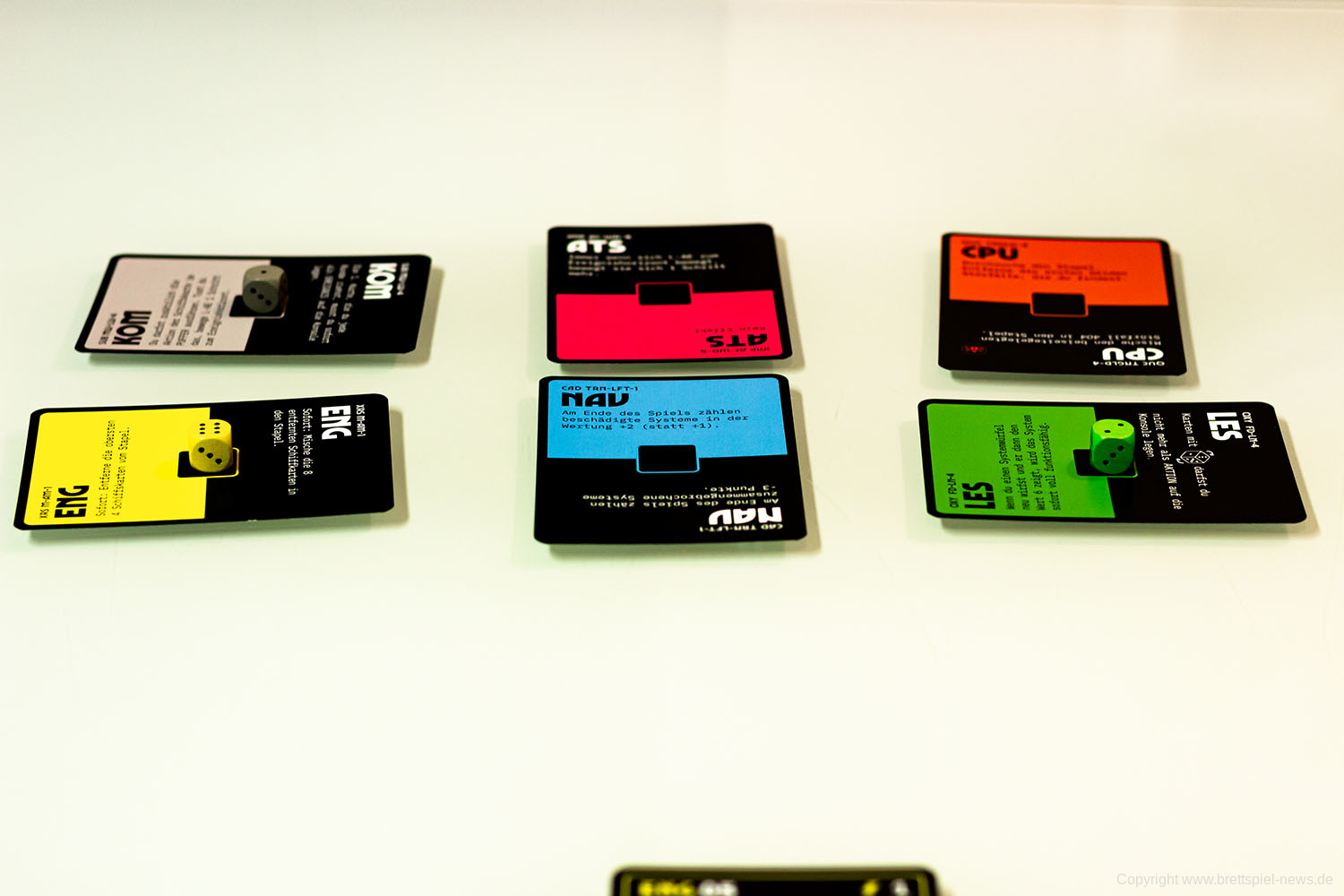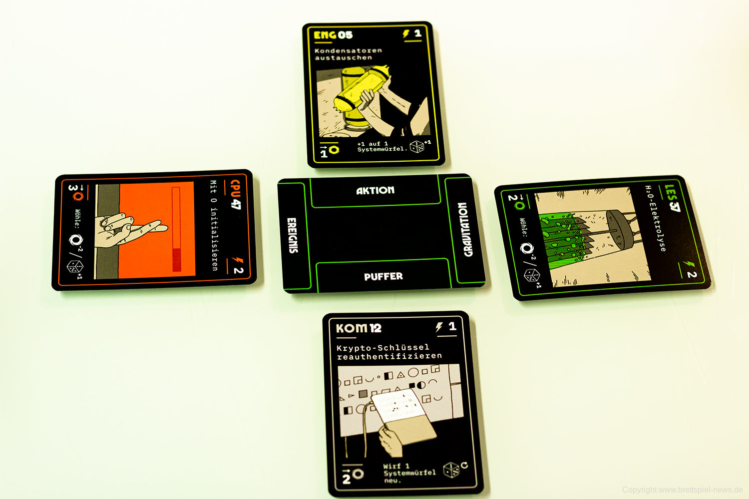 Zudem ist die Abstraktion der Karten in diesem Kontext tatsächlich sehr gut durchdacht und förderlich. Das Relevante an den Karten sind zwei Zahlenwerte und der Text. Durch die nüchterne Optik ist das Auge nicht abgelenkt, es werden keine opulenten Grafiken geliefert, die kaum jemand wertgeschätzt hätte. Sie hätten das Spiel nicht besser gemacht, sondern unter Umständen sogar gestört.
